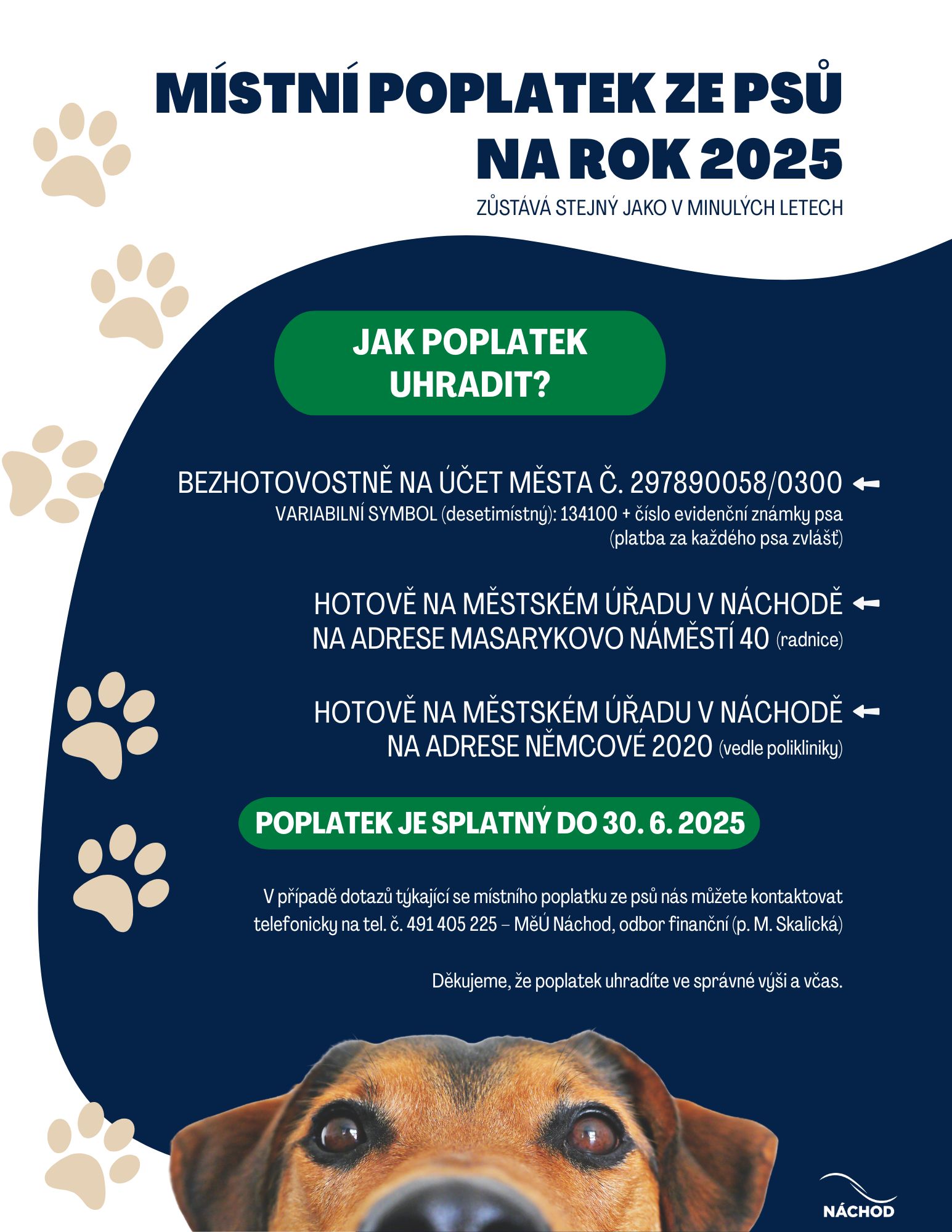 V případě dotazů týkající se místního poplatku ze psů nás můžete kontaktovat telefonicky na tel. č. 491 405 225 - MěÚ Náchod, odbor finanční (M. Skalická)