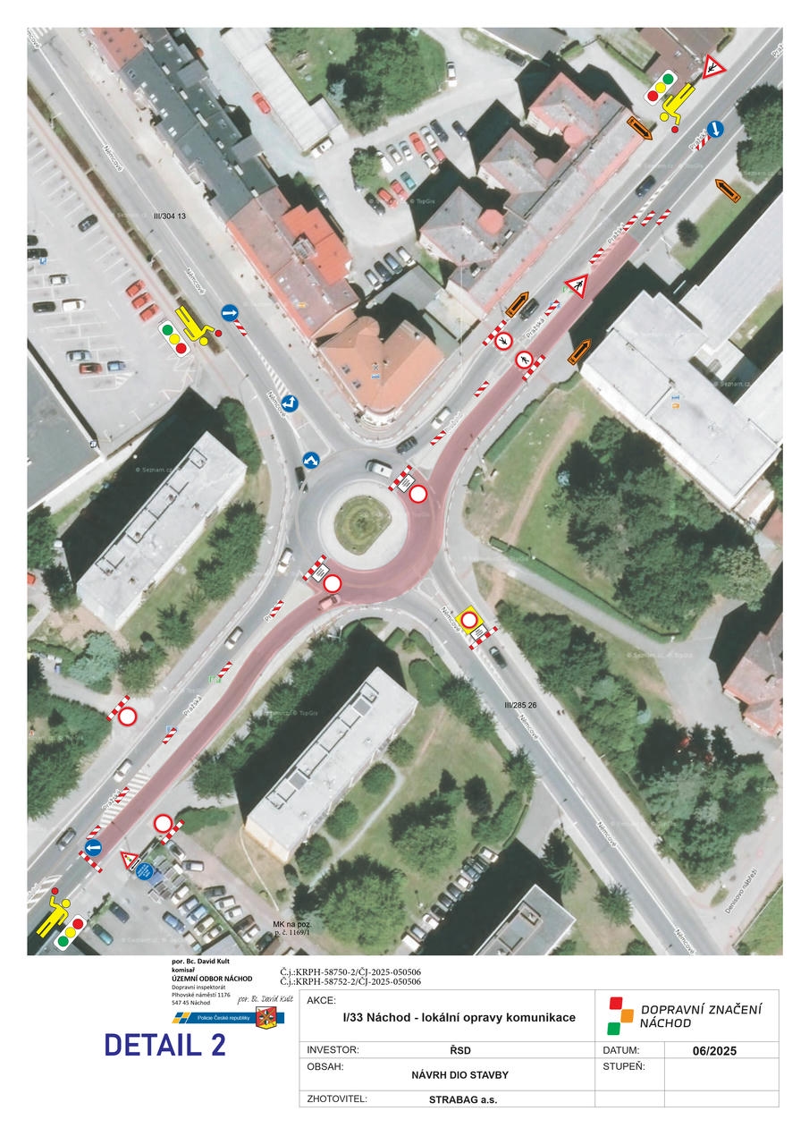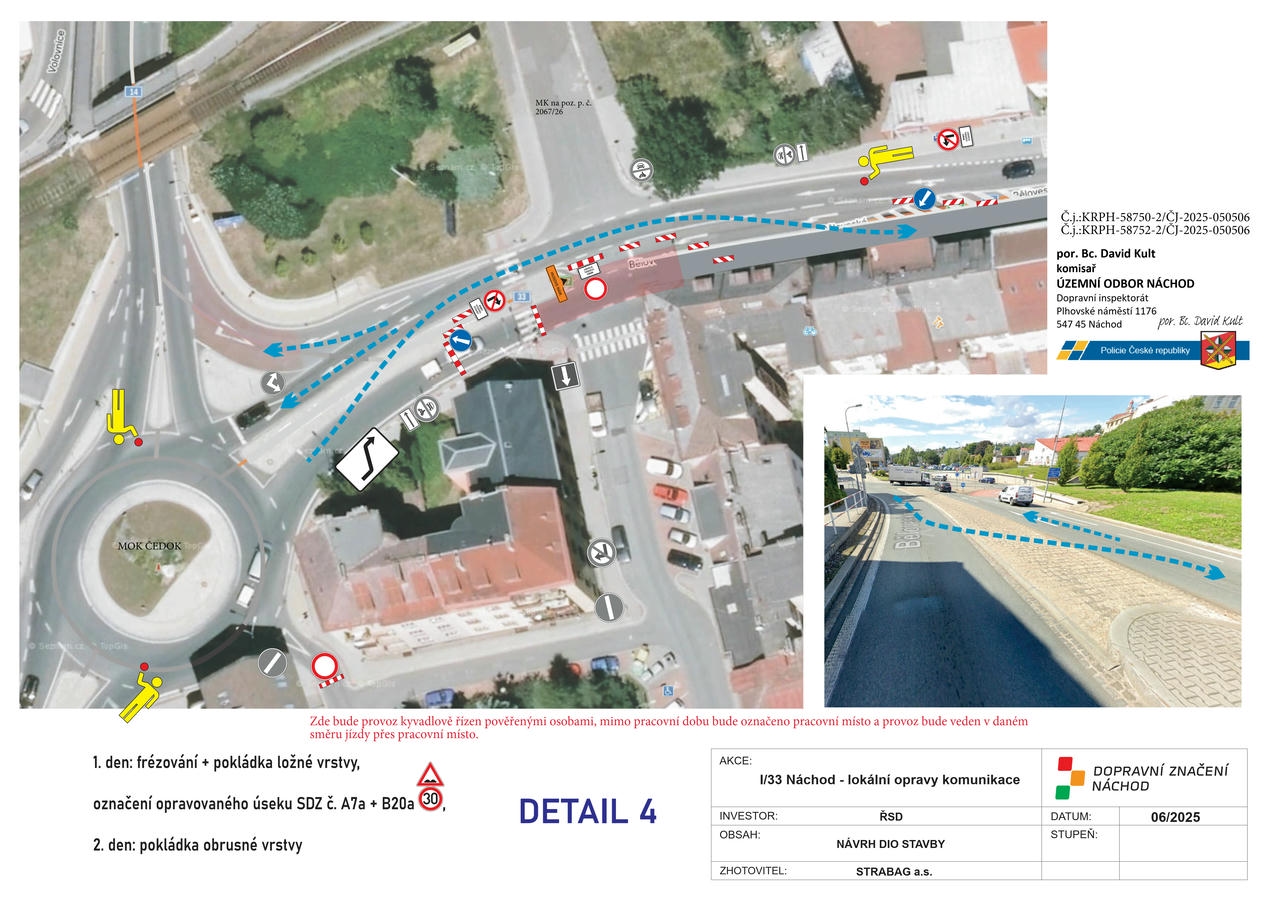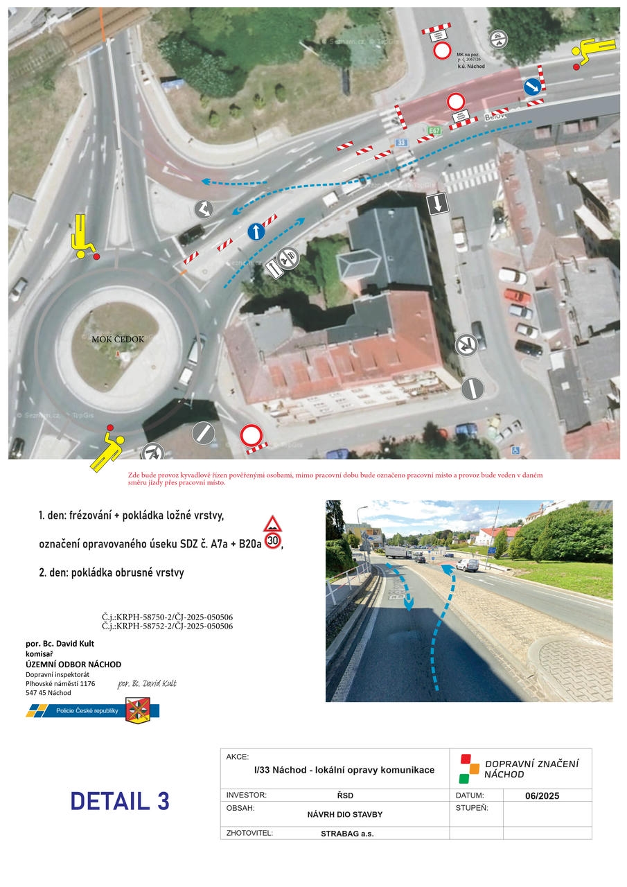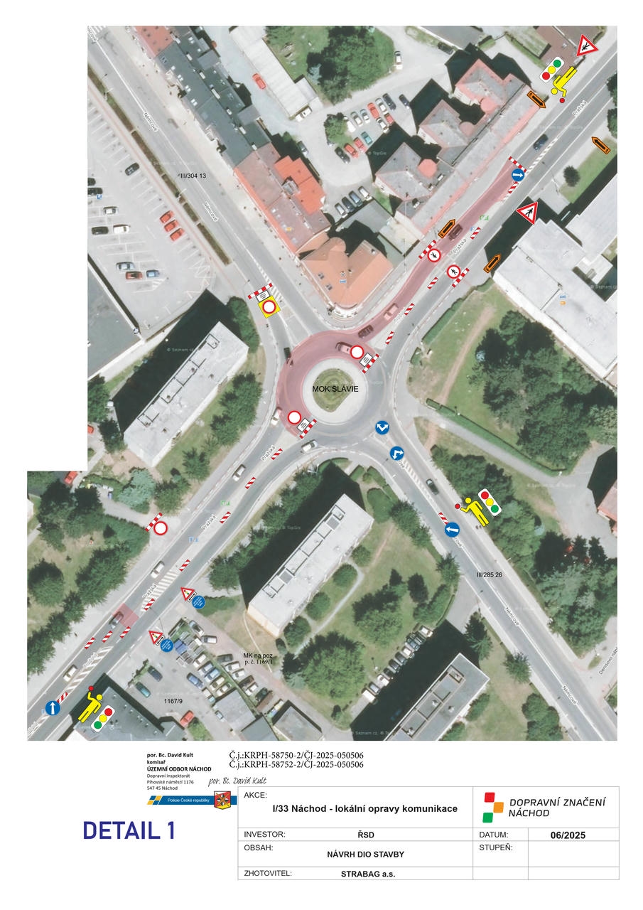 Práce budou zahrnovat frézování a pokládku nových vrstev asfaltobetonu, včetně úprav na okružní křižovatce „Slávie". V souvislosti s opravou této křižovatky v centru Náchoda dojde k výraznému omezení provozu v ulici Němcové. Práce budou probíhat po polovinách křižovatky, v místě aktuální opravy nebude možný vjezd ani výjezd a řidiči budou muset využít objízdné trasy.