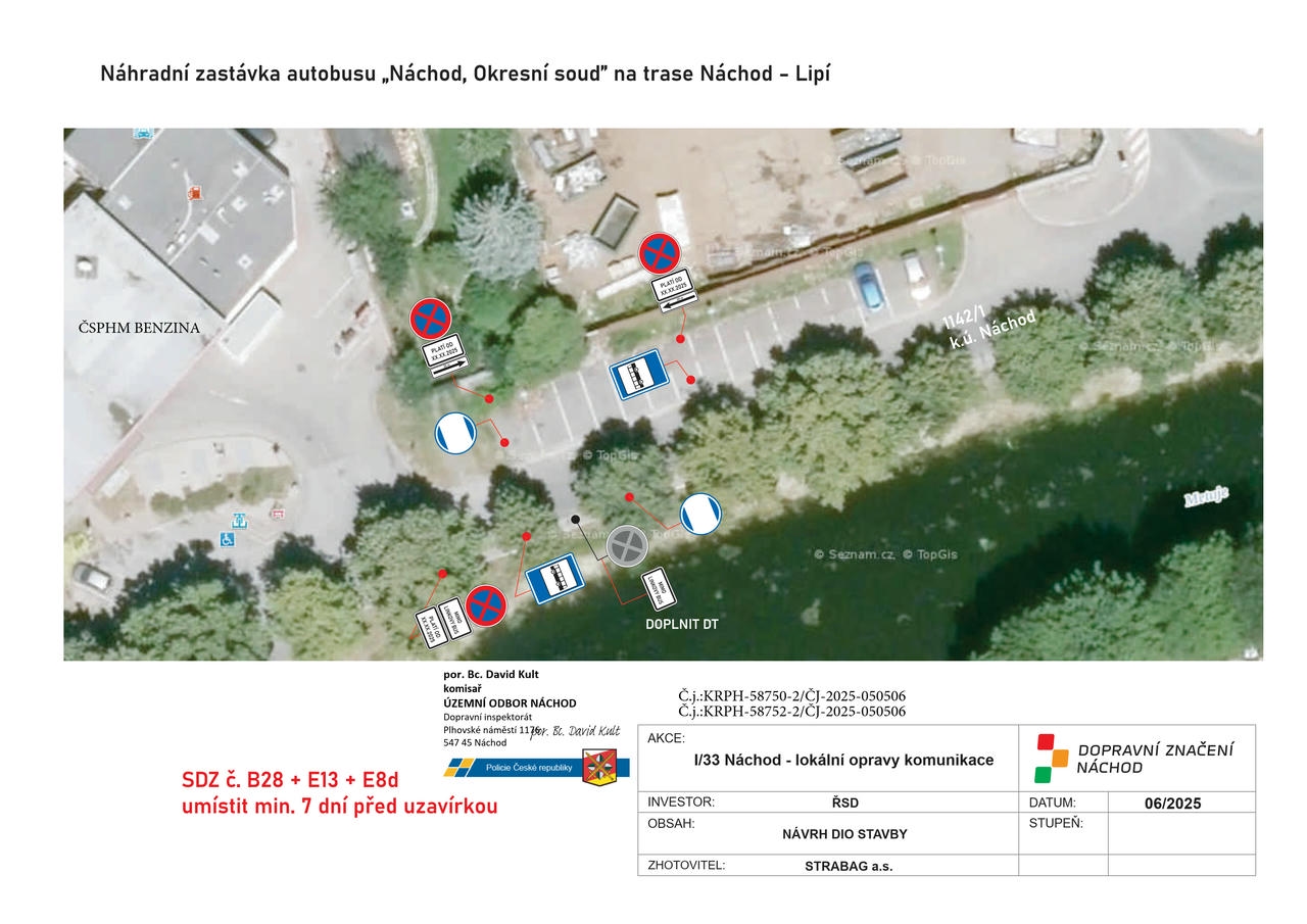 - Autobusová zastávka "Náchod, Okresní soud" na trase Náchod – Lipí bude přesunuta k čerpací stanici ORLEN, a to pouze po dva dny (7. a 8. 7.), kdy budou probíhat práce na opravě pravé části OK Slávie ve směru od Hradce Králové a autobusy budou jezdit po objízdné trase kolem ČS Orlen, dále ulicí Dobrošovská a Purkyňova. Na zastávkách bude umístěno upozornění pro cestující.