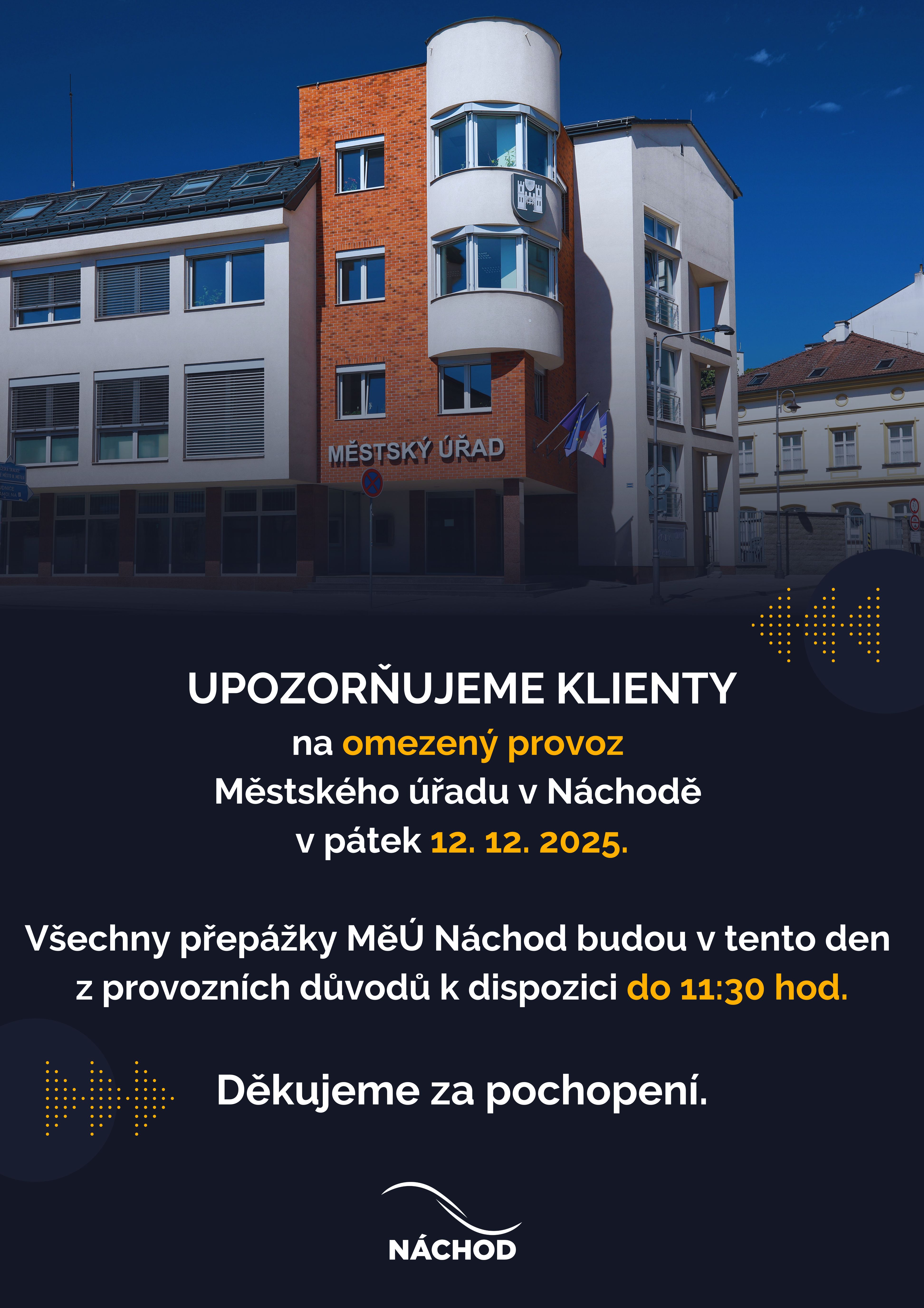 Upozorňujeme klienty, že v pátek 12. 12. 2025 bude provoz Městského úřadu v Náchodě omezen.