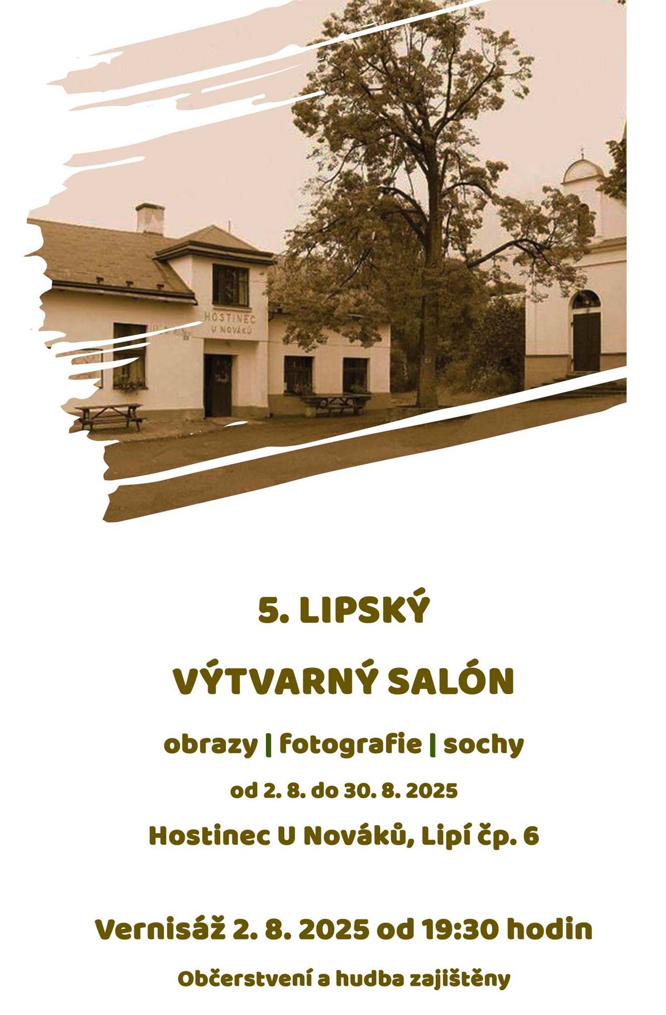 5. Lipský výtvarný salón Hostinec U Nováků Lipí 02.08.2025 - 30.08.2025, Vstupné: Zveme vás na 5. Lipský výtvarný salón, který se uskuteční ve dnech 2.–30. srpna 2025 v Hostinci U Nováků, Lipí čp. 6. Vernisáž proběhne v sobotu 2. srpna 2025 od 19:30 hodin. Plakát 5. Lipský výtvarný salón