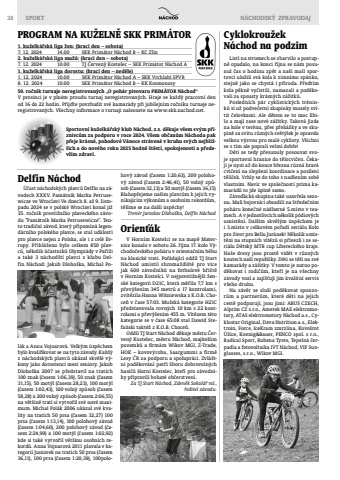 28 SPORT N%u00c1CHODSK%u00dd ZPRAVODAJPROGRAM NA KU%u017dELN%u011a SKK PRIM%u00c1TOROrien%u0165%u00e1k1. ku%u017eelk%u00e1%u0159sk%u00e1 liga %u017een: (hrac%u00ed den %u2013 sobota)7. 12. 2024 14.00 SKK Prim%u00e1tor N%u00e1chod B %u2013 KC Zl%u00edn2. ku%u017eelk%u00e1%u0159sk%u00e1 liga mu%u017e%u016f: (hrac%u00ed den %u2013 sobota)7. 12. 2024 10.00 TJ %u010cerven%u00fd Kostelec %u2013 SKK Prim%u00e1tor N%u00e1chod A1. ku%u017eelk%u00e1%u0159sk%u00e1 liga dorostu: (hrac%u00ed den %u2013 ned%u011ble)1. 12. 2024 10.00 SKK Prim%u00e1tor N%u00e1chod A %u2013 SKK Vrchlab%u00ed SPVR8. 12. 2024 10.00 SKK Prim%u00e1tor N%u00e1chod B %u2013 KK Kosmonosy50. ro%u010dn%u00edk turnaje neregistrovan%u00fdch %u201eO poh%u00e1r pivovaru PRIM%u00c1TOR N%u00e1chod%u201cV prosinci je v pln%u00e9m proudu turnaj neregistrovan%u00fdch. Hraje se ka%u017ed%u00fd pracovn%u00ed den od 16 do 22 hodin. P%u0159ij%u010fte povzbudit sv%u00e9 kamar%u00e1dy p%u0159i jubilejn%u00edm ro%u010dn%u00edku turnaje neregistrovan%u00fdch. V%u0161echny informace o turnaji naleznete na www.skk.nachod.net. Sportovn%u00ed ku%u017eelk%u00e1%u0159sk%u00fd klub N%u00e1chod, z.s. d%u011bkuje v%u0161em sv%u00fdm p%u0159%u00edznivc%u016fm za podporu v roce 2024. V%u0161em ob%u010dan%u016fm N%u00e1choda pak p%u0159eje kr%u00e1sn%u00e9, pohodov%u00e9 V%u00e1noce str%u00e1ven%u00e9 v kruhu sv%u00fdch nejbli%u017e%u0161%u00edch a do nov%u00e9ho roku 2025 hodn%u011b %u0161t%u011bst%u00ed, spokojenosti a p%u0159edev%u0161%u00edm zdrav%u00ed.V Horn%u00edm Kostelci se na map%u011b Maternice konalo v sobotu 26. %u0159%u00edjna 17. kolo V%u00fdchodo%u010desk%u00e9ho poh%u00e1ru v orienta%u010dn%u00edm b%u011bhu na klasick%u00e9 trati. Po%u0159%u00e1daj%u00edc%u00ed odd%u00edl TJ Start N%u00e1chod um%u00edstil shroma%u017edi%u0161t%u011b pro v%u00edce jak 600 z%u00e1vodn%u00edk%u016f na fotbalov%u00e9 h%u0159i%u0161t%u011b v Horn%u00edm Kostelci. V nejpresti%u017en%u011bj%u0161%u00ed %u017eensk%u00e9 kategorii D21C, kter%u00e1 m%u011b%u0159ila 7,7 km s p%u0159ev%u00fd%u0161en%u00edm 345 metr%u016f a 17 kontrolami, zv%u00edt%u011bzila Hanna Wi%u015bniewska z K.O.B. Choce%u0148 v %u010dase 57:03. Mu%u017esk%u00e1 kategorie H21C p%u0159edstavovala rovn%u00fdch 10 km s 22 kontrolami a p%u0159ev%u00fd%u0161en%u00edm 455 m. V%u00edt%u011bzem t%u00e9to kategorie se v %u010dase 65:08 stal Dawid Stefa%u0144ski takt%u00e9%u017e z K.O.B. Choce%u0148. Odd%u00edl TJ Start N%u00e1chod d%u011bkuje m%u011bstu %u010cerven%u00fd Kostelec, m%u011bstu N%u00e1chod, majitel%u016fm pozemk%u016f a fi rm%u00e1m Wikov MGI, Z-Trade, HOK %u2013 kovov%u00fdroba, Saargummi a fi rm%u011b Lesy %u010cR za podporu a spolupr%u00e1ci. Zvl%u00e1%u0161tn%u00ed pod%u011bkov%u00e1n%u00ed pat%u0159%u00ed Sboru dobrovoln%u00fdch hasi%u010d%u016f Horn%u00ed Kostelec, kte%u0159%u00ed pro z%u00e1vodn%u00edky p%u0159ipravili bohat%u00e9 ob%u010derstven%u00ed. Za TJ Start N%u00e1chod, Zden%u011bk Sokol%u00e1%u0159 ml., %u0159editel z%u00e1vodu.%u00da%u010dast n%u00e1chodsk%u00fdch plavc%u016f Delf%u00edn na z%u00e1vodech XXXV. Pam%u00e1tn%u00edk Marka Petrusewicze ve Wroclavi Ve dnech 8. a%u017e 9. listopadu 2024 se v polsk%u00e9 Wroclavi konal ji%u017e 35. ro%u010dn%u00edk presti%u017en%u00edho plaveck%u00e9ho z%u00e1vodu \to tradi%u010dn%u00ed z%u00e1vod, kter%u00fd p%u0159ipom%u00edn%u00e1 legend%u00e1rn%u00edho polsk%u00e9ho plavce, se stal ud%u00e1lost%u00ed pro plavce nejen z Polska, ale i z cel%u00e9 Evropy. P%u0159ihl%u00e1%u0161eno bylo celkem 850 plavc%u016f, n%u011bkolik %u00fa%u010dastn%u00edk%u016f Olympi%u00e1dy v Pa%u0159%u00ed%u017ei a tak%u00e9 3 n%u00e1chod%u0161t%u00ed plavci z klubu Delf%u00edn N%u00e1chod: Jakub Dloho%u0161ka, Michal PoDelf%u00edn N%u00e1chodl%u00e1k a Anna Vojnarov%u00e1. Velk%u00fdm %u00fasp%u011bchem bylo kvalifi kovat se na tyto z%u00e1vody. Ka%u017ed%u00fd z n%u00e1chodsk%u00fdch plavc%u016f uk%u00e1zal skv%u011bl%u00e9 v%u00fdkony jako dorostenci mezi seniory. Jakub Dloho%u0161ka 2007 se p%u0159edstavil na trat%u00edch 100 znak (%u010dasem 1:06,39), 50 znak (%u010dasem 31,15), 50 mot%u00fdl (%u010dasem 28,23), 100 mot%u00fdl (%u010dasem 1:02,43), 100 voln%u00fd zp%u016fsob (%u010dasem 58,28) a 200 voln%u00fd zp%u016fsob (%u010dasem 2:06,55) na v%u011bt%u0161in%u011b trat%u00ed si vytvo%u0159il sv%u00e9 nov%u00e9 maximum. Michal Pol%u00e1k 2006 uk%u00e1zal sv%u00e9 kvality na trat%u00edch 50 prsa (%u010dasem 32,27) 100 prsa (%u010dasem 1:13,14), 100 polohov%u00fd z%u00e1vod (%u010dasem 1:04,60), 200 polohov%u00fd z%u00e1vod (%u010dasem 2:24,99) a 100 mot%u00fdl (%u010dasem 1:02,92) kde si tak%u00e9 vytvo%u0159il v%u011bt%u0161inu osobn%u00edch rekord%u016f. Anna Vojnarov%u00e1 2011 plavala v kategorii Juniorek na trat%u00edch 50 prsa (%u010dasem 36,11), 100 prsa (%u010dasem 1:20,39), 100poloList%u00ed na stromech se zbarvilo a postupn%u011b opadalo, na konci %u0159%u00edjna se n%u00e1m posunul %u010das o hodinu zp%u011bt a na%u0161i mal%u00ed sportovci ulo%u017eili sv%u00e1 kola k zimn%u00edmu sp%u00e1nku, stejn%u011b jako se chyst%u00e1 i p%u0159%u00edroda. P%u0159edt%u00edm kola p%u011bkn%u011b vy%u010distili, namazali a pod%u011bkovali za spousty kr%u00e1sn%u00fdch z%u00e1%u017eitk%u016f. Posledn%u00edch p%u00e1r cyklistick%u00fdch tr%u00e9nink%u016f si u%u017e podve%u010dern%u00ed skupinky musely sv%u00edtit %u010delovkami. Ale d%u011btem se to moc l%u00edbilo a maj%u00ed zase nov%u00e9 z%u00e1%u017eitky. Takov%u00e1 j%u00edzda na kole v ter%u00e9nu, p%u0159es p%u0159ek%u00e1%u017eky a ve skupin%u011b za svitu r%u016fzn%u00fdch sv%u011bt%u00fdlek je opravdu velkou v%u00fdzvou pro mal%u00e9 cyklisty. V%u0161ichni se s t%u00edm ale poprali velmi dob%u0159e!D%u011bti se tedy p%u0159esunuly posouvat svoje sportovn%u00ed hranice do t%u011blocvi%u010den. %u010cekaj%u00ed je nyn%u00ed a%u017e do konce b%u0159ezna r%u016fzn%u00e1 hrav%u00e1 cvi%u010den%u00ed na zlep%u0161en%u00ed koordinace a pos%u00edlen%u00ed t%u011bl%u00ed%u010dek. Vrhly se do toho s 