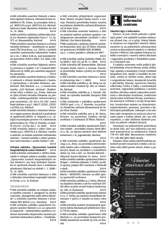 PROSINEC ZPR%u00c1VY Z RADNICE 3* * *V%u00e1no%u010dn%u00ed tipy z infocentraV%u00e1noce, to jsou chv%u00edle pohody a spln%u011bn%u00fdch p%u0159%u00e1n%u00ed. Sv%u00e9 nejbli%u017e%u0161%u00ed tou%u017e%u00edme obdarovat p%u0159esn%u011b t%u00edm, co si p%u0159ej%u00ed. Pokud hled%u00e1te inspiraci na origin%u00e1ln%u00ed v%u00e1no%u010dn%u00ed d%u00e1rky, zastavte se na pobo%u010dk%u00e1ch informa%u010dn%u00edho centra na Masarykov%u011b n%u00e1m%u011bst%u00ed a v Mal%u00fdch l%u00e1zn%u00edch v B%u011blovsi, kde najdete bohatou nab%u00eddku suven%u00fdr%u016f s motivy m%u011bsta N%u00e1choda i region%u00e1ln%u00ed produkty z Kladsk%u00e9ho pomez%u00ed a Orlick%u00fdch hor. V nab%u00eddce naleznete vedle jedl%u00fdch d%u00e1rk%u016f (%u010dokol%u00e1dy, ovocn%u00e9 d%u017eemy, medy, o%u0159%u00ed%u0161ky, %u010daje, oplatky a l%u00e1zn%u011bnky) i ru%u010dn%u011b vyr%u00e1b%u011bn%u00e9 koupelov%u00e9 soli, m%u00fddla a knofl%u00edky do %u0161atn%u00edku, sv%u00ed%u010dky ze v%u010del%u00edho vosku, jelen%u00ed loje v origin%u00e1ln%u00edm balen%u00ed, keramick%u00e9 hrne%u010dky a plech%u00e1%u010dky, k%u0161andy, sportovn%u00ed %u010delenky, n%u00e1kr%u010dn%u00edky, tri%u010dka a ta%u0161ky s n%u00e1chodsk%u00fdm motivem, region%u00e1ln%u00ed publikace a mnoho dal%u0161%u00edho. D%u011btskou radost vykouzl%u00edte textiln%u00edmi a d%u0159ev%u011bn%u00fdmi hra%u010dkami, tradi%u010dn%u00edmi plechov%u00fdmi hra%u010dkami Kovap, stavebnicemi kovov%u00fdch zv%u00ed%u0159%u00e1tek a stroj%u016f firmy Merkur, kreativn%u00edmi sadami na domalov%u00e1n%u00ed, omalov%u00e1nkami, pexesem, puzzlem a Babi%u010d%u010din%u00fdmi poh%u00e1dkami. Zakoupit u n%u00e1s m%u016f%u017eete tak%u00e9 vstupenky na kulturn%u00ed akce konan%u00e9 nejen v na%u0161em m%u011bst%u011b, ale i po cel%u00e9 republice, a tak%u00e9 obl%u00edben%u00e9 d%u00e1rkov%u00e9 poukazy na piknik v Mal%u00fdch l%u00e1zn%u00edch. Sortiment na jednotliv%u00fdch pobo%u010dk%u00e1ch se m%u016f%u017ee li%u0161it, pro v%u00edce informac%u00ed n%u00e1s m%u016f%u017eete kontaktovat na telefonn%u00edch %u010d%u00edslech 778 411 680 (MIC Masarykovo n%u00e1m%u011bst%u00ed), 771 128 492 (MIC Mal%u00e9 l%u00e1zn%u011b).P%u0159ejeme v%u0161em na%u0161im n%u00e1v%u0161t%u011bvn%u00edk%u016fm pohodov%u00e9 pro%u017eit%u00ed v%u00e1no%u010dn%u00edch sv%u00e1tk%u016f a do nov%u00e9ho roku 2025 pevn%u00e9 zdrav%u00ed, %u0161t%u011bst%u00ed a pohodu.M%u011bstsk%u00e9informa%u010dn%u00edcentrum RM schv%u00e1lila uzav%u0159en%u00ed Dohody o ukon%u010den%u00ed n%u00e1jemn%u00ed smlouvy s Ministerstvem zem%u011bd%u011blstv%u00ed %u010cR, Praha, na pron%u00e1jem %u010d%u00e1sti p.p.%u010d. 2067/133 a p.p.%u010d. 2067/134, k.%u00fa. N%u00e1chod. Smlouva bude ukon%u010dena dohodou ke dni 31. 12. 2024. 8-0-0 RM schv%u00e1lila vyhl%u00e1%u0161en%u00ed v%u00fdb%u011brov%u00e9ho %u0159%u00edzen%u00ed na obsazen%u00ed n%u00e1jemn%u00edho bytu %u010d. 13, %u010dp. 577, ul. Komensk%u00e9ho, N%u00e1chod. 8-0-0 RM schv%u00e1lila uzav%u0159en%u00ed Smlouvy o z%u0159%u00edzen%u00ed v%u011bcn%u00e9ho b%u0159emene %u2013 slu%u017eebnosti se spole%u010dnost%u00ed %u010cEZ Distribuce, a.s., D%u011b%u010d%u00edn, v podob%u011b um%u00edst%u011bn%u00ed nadzemn%u00edho kabelov%u00e9ho veden%u00ed nn a vn, v d%u00e9lce 8,36 m, nad pozemkov%u00fdmi parcelami 354/4 a 428/1, k.%u00fa. Bab%u00ed u N%u00e1choda. 8-0-0 RM schv%u00e1lila uzav%u0159en%u00ed N%u00e1jemn%u00ed smlouvy prostoru o v%u00fdm%u011b%u0159e 1 m2 v budov%u011b M%u011b%u00da, N%u011bmcov%u00e9 %u010dp. 2020, pro um%u00edst%u011bn%u00ed n%u00e1pojov%u00e9ho automatu. 8-0-0 RM schv%u00e1lila uzav%u0159en%u00ed Smlouvy o budouc%u00ed smlouv%u011b o z%u0159%u00edzen%u00ed slu%u017eebnosti s budouc%u00ed opr%u00e1vn%u011bnou z v%u011bcn%u00e9ho b%u0159emene, spole%u010dnost%u00ed VAK N%u00e1chod, a.s., a investorem stavby %u201eI/33 N%u00e1chod, obchvat%u201c, %u0158editelstv%u00edm silnic a d%u00e1lnic s.p., Praha, Smlouva se t%u00fdk%u00e1 z%u0159%u00edzen%u00ed v%u011bcn%u00e9ho b%u0159emene na p%u0159elo%u017eku vodohospod%u00e1%u0159sk%u00e9 infrastruktury pod ozna%u010den%u00edm %u201eSO 314 a SO 318%u201c, kter%u00e1 bude ulo%u017eena v p.p.%u010d. 1961/7, 2152/1, 2155/1 a 2155/4, k.%u00fa. N%u00e1chod. 8-0-0 RM schv%u00e1lila Dohodu o ukon%u010den%u00ed Smlouvy o n%u00e1jmu prostor slou%u017e%u00edc%u00edch k podnik%u00e1n%u00ed se spole%u010dnost%u00ed MUDr. A. Vejmola s.r.o., t%u00fdkaj%u00edc%u00ed se pron%u00e1jmu prostor v II: nadzemn%u00edm pat%u0159e budovy %u010dp. 1759, ul. Pra%u017esk%u00e1, o v%u00fdm%u011b%u0159e 10,2 m2, a to ke dni 1. 12. 2024. 8-0-0 RM schv%u00e1lila %u017e%u00e1dost o z%u00e1bor %u010d%u00e1sti pozemku p.p.%u010d. 2067/19, k.%u00fa. N%u00e1chod, v parku u n%u00e1dra%u017e%u00ed, za %u00fa%u010delem um%u00edst%u011bn%u00ed reklamn%u00edho za%u0159%u00edzen%u00ed %u2013 lanov%u00e9 seda%u010dky v r%u00e1mci prezentace nov%u00e9 lanovky v are%u00e1lu De%u0161tn%u00e9 v OH. 8-0-0Ve%u0159ejn%u00e1 zak%u00e1zka %u201eZpracov%u00e1n%u00ed Lesn%u00edch hospod%u00e1%u0159sk%u00fdch osnov N%u00e1chod I.%u201c 8-0-0 RM schv%u00e1lila rozhodnut%u00ed o v%u00fdb%u011bru dodavatele k ve%u0159ejn%u00e9 zak%u00e1zce mal%u00e9ho rozsahu %u201eZpracov%u00e1n%u00ed Lesn%u00edch hospod%u00e1%u0159sk%u00fdch osnov N%u00e1chod I. pro lesy drobn%u00fdch vlastn%u00edk%u016f ve spr%u00e1vn%u00edm obvodu obce s roz%u0161%u00ed%u0159enou p%u016fsobnost%u00ed N%u00e1chod na obdob%u00ed 1. 1. 2026%u201331. 12. 2035. RM schv%u00e1lila uzav%u0159en%u00ed Smlouvy o d%u00edlo s v%u00edt%u011bzn%u00fdm %u00fa%u010dastn%u00edkem Lesprojekt v%u00fdchodn%u00ed %u010cechy, s.r.o., H. Kr%u00e1lov%u00e9.TELEGRAFICKY: RM schv%u00e1lila nab%u00eddku ve ve%u0159ejn%u00e9 zak%u00e1zce mal%u00e9ho rozsahu 3. kategorie na slu%u017eby s n%u00e1zvem %u201eEnergetick%u00fd audit m%u011bsta N%u00e1choda%u201c a schv%u00e1lila uzav%u0159en%u00ed Smlouvy s %u00fa%u010dastn%u00edkem PKV BUILD s.r.o., Seno%u017eaty. 8-0-0 RM