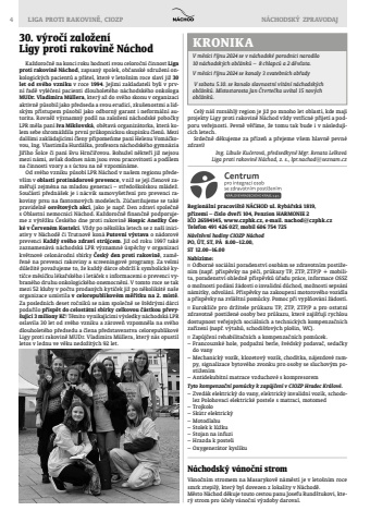 4 LIGA PROTI RAKOVIN%u011a, CIOZP N%u00c1CHODSK%u00dd%u2009 ZPRAVODAJ KRONIKARegion%u00e1ln%u00ed pracovi%u0161t%u011b N%u00c1CHOD ul. Ryb%u00e1%u0159sk%u00e1 1819, p%u0159%u00edzem%u00ed %u2013 %u010d%u00edslo dve%u0159%u00ed 104, Penzion HARMONIE 2I%u010cO 26594145, www.czphk.cz, e-mail. nachod@czphk.czTelefon 491 426 027, mobil 606 754 725N%u00e1v%u0161t%u011bvn%u00ed hodiny CIOZP N%u00e1chodPO, %u00daT, ST, P%u00c1 8.00%u201312.00, ST 12.00%u201316.00Nab%u00edz%u00edme: Odborn%u00e9 soci%u00e1ln%u00ed poradenstv%u00ed osob%u00e1m se zdravotn%u00edm posti%u017een%u00edm (nap%u0159. p%u0159%u00edsp%u011bvky na p%u00e9%u010di, pr%u016fkazy TP, ZTP, ZTP/P + mobilita, poradenstv%u00ed ohledn%u011b p%u0159%u00edsp%u011bvk%u016f %u00fa%u0159adu pr%u00e1ce, informace OSSZ o mo%u017enosti pod%u00e1n%u00ed %u017e%u00e1dosti o invalidn%u00ed d%u016fchod, mo%u017enosti seps%u00e1n%u00ed n%u00e1mitky, odvol%u00e1n%u00ed. P%u0159%u00edsp%u011bvky na zakoupen%u00ed motorov%u00e9ho vozidla a p%u0159%u00edsp%u011bvky na zvl%u00e1%u0161tn%u00ed pom%u016fcky. Pomoc p%u0159i vypl%u0148ov%u00e1n%u00ed %u017e%u00e1dost%u00ed. Eurokl%u00ed%u010de pro dr%u017eitele pr%u016fkazu TP, ZTP, ZTP/P a pro ostatn%u00ed zdravotn%u011b posti%u017een%u00e9 osoby bez pr%u016fkazu, kter%u00e9 zaji%u0161%u0165uj%u00ed rychlou dostupnost ve%u0159ejn%u00fdch soci%u00e1ln%u00edch a technick%u00fdch kompenza%u010dn%u00edch za%u0159%u00edzen%u00ed (nap%u0159. v%u00fdtah%u016f, schodi%u0161%u0165ov%u00fdch plo%u0161in, WC). Zap%u016fj%u010den%u00ed rehabilita%u010dn%u00edch a kompenza%u010dn%u00edch pom%u016fcek.%u2013 Francouzsk%u00e9 hole, podpa%u017en%u00ed berle, %u0161v%u00e9dsk%u00fd podava%u010d, seda%u010dky do vany%u2013 Mechanick%u00fd voz%u00edk, klozetov%u00fd voz%u00edk, chod%u00edtka, n%u00e1jezdov%u00e9 rampy, signalizace bytov%u00e9ho zvonku pro osoby se sluchov%u00fdm posti%u017een%u00edm%u2013 Antidekubitn%u00ed matrace vzduchov%u00e9 s kompresoremTyto kompenza%u010dn%u00ed pom%u016fcky k zap%u016fj%u010den%u00ed v CIOZP Hradec Kr%u00e1lov%u00e9.%u2013 Zved%u00e1k elektrick%u00fd do vany, elektrick%u00fd invalidn%u00ed voz%u00edk, schodolez Polohovac%u00ed elektrick%u00e9 postele s matrac%u00ed, motomed%u2013 Trojkolo%u2013 Sk%u00fatr elektrick%u00fd %u2013 Motodlahu %u2013 Stolek k l%u016f%u017eku%u2013 Stojan na infuzi%u2013 Hrazda k posteli%u2013 Oxygener%u00e1tor kysl%u00edkuV m%u011bs%u00edci %u0159%u00edjnu 2024 se v n%u00e1chodsk%u00e9 porodnici narodilo 10 n%u00e1chodsk%u00fdch ob%u010d%u00e1nk%u016f %u2013 8 chlapc%u016f a 2 d%u011bv%u010data.V m%u011bs%u00edci %u0159%u00edjnu 2024 se konaly 3 svatebn%u00edch ob%u0159ady V sobotu 5.10. se konalo slavnostn%u00ed v%u00edt%u00e1n%u00ed n%u00e1chodsk%u00fdch ob%u010d%u00e1nk%u016f. M%u00edstostarosta Jan %u010ctvrte%u010dka uv%u00edtal 15 nov%u00fdch ob%u010d%u00e1nk%u016f.Ka%u017edoro%u010dn%u011b na konci roku hodnot%u00ed svou celoro%u010dn%u00ed %u010dinnost Liga proti rakovin%u011b N%u00e1chod, zapsan%u00fd spolek, ob%u010dansk%u00e9 sdru%u017een%u00ed onkologick%u00fdch pacient%u016f a p%u0159%u00e1tel, kter%u00e9 v leto%u0161n%u00edm roce slav%u00ed ji%u017e 30 let od sv%u00e9ho vzniku v roce 1994. Jej%u00edmi zakladateli byli v prvn%u00ed %u0159ad%u011b vyl%u00e9%u010den%u00ed pacienti dlouholet%u00e9ho n%u00e1chodsk%u00e9ho onkologa MUDr. Vladim%u00edra M%u00fcllera, kter%u00fd a%u017e do sv%u00e9ho skonu v organizaci aktivn%u011b p%u016fsobil jako p%u0159edseda a svou erudic%u00ed, zku%u0161enostmi a lidsk%u00fdm p%u0159%u00edstupem p%u016fsobil jako odborn%u00fd garant i neform%u00e1ln%u00ed autorita. Rovn%u011b%u017e v%u00fdznamn%u00fd pod%u00edl na zalo%u017een%u00ed n%u00e1chodsk%u00e9 pobo%u010dky LPR m%u011bla pan%u00ed Iva Mik%u0161ovsk%u00e1, ob%u011btav%u00e1 organiz%u00e1torka, kter%u00e1 kolem sebe shrom%u00e1%u017edila prvn%u00ed pr%u016fkopnickou skupinku %u010dlen%u016f. Mezi dal%u0161%u00edmi zakl%u00e1daj%u00edc%u00edmi %u010dleny p%u0159ipome%u0148me pan%u00ed Helenu Vom%u00e1%u010dkovou, Ing. Vlastimila Hurd%u00e1lka, profesora n%u00e1chodsk%u00e9ho gymn%u00e1zia Ji%u0159%u00edho %u0160olce %u010di pan%u00ed Evu Hrn%u010d%u00ed%u0159ovou. Bohu%u017eel n%u011bkte%u0159%u00ed ji%u017e nejsou mezi n%u00e1mi, av%u0161ak dodnes n%u00e1m jsou svou pracovitost%u00ed a pod%u00edlem na %u010dinnosti vzory a s %u00factou na n%u011b vzpom%u00edn%u00e1me. Od sv%u00e9ho vzniku p%u016fsob%u00ed LPR N%u00e1chod v na%u0161em regionu p%u0159edev%u0161%u00edm v oblasti protin%u00e1dorov%u00e9 prevence, v n%u00ed%u017e se jej%u00ed %u010dlenov%u00e9 zam%u011b%u0159uj%u00ed zejm%u00e9na na mladou generaci %u2013 st%u0159edo%u0161kolskou ml%u00e1de%u017e. Sou%u010d%u00e1st%u00ed p%u0159edn%u00e1%u0161ek je i n%u00e1cvik samovy%u0161et%u0159en%u00ed pro prevenci rakoviny prsu na fantomov%u00fdch modelech. Z%u00fa%u010dast%u0148ujeme se tak%u00e9 pravideln%u011b osv%u011btov%u00fdch akc%u00ed, jako je nap%u0159. Den zdrav%u00ed spole%u010dn%u011b s Oblastn%u00ed nemocnic%u00ed N%u00e1chod. Ka%u017edoro%u010dn%u011b finan%u010dn%u011b podporujeme z v%u00fdt%u011b%u017eku %u010cesk%u00e9ho dne proti rakovin%u011b Hospic Ane%u017eky %u010cesk%u00e9 v %u010cerven%u00e9m Kostelci. V%u017edy po n%u011bkolika letech se z na%u0161%u00ed iniciativy v N%u00e1chod%u011b %u010di Trutnov%u011b kon%u00e1 Putovn%u00ed v%u00fdstava o n%u00e1dorov%u00e9 prevenci Ka%u017ed%u00fd sv%u00e9ho zdrav%u00ed str%u016fjcem. Ji%u017e od roku 1997 tak%u00e9 zaznamen%u00e1v%u00e1 n%u00e1chodsk%u00e1 LPR v%u00fdznamn%u00e9 %u00fasp%u011bchy v organizaci kv%u011btnov%u00e9 celon%u00e1rodn%u00ed sb%u00edrky %u010cesk%u00fd den proti rakovin%u011b, zam%u011b%u0159en%u00e9 na prevenci rakoviny a screeningov%u00e9 programy. Za velmi d%u016fle%u017eit%u00e9 pova%u017eujeme to, %u017ee ka%u017ed%u00fd d%u00e1rce obdr%u017e%u00ed k symbolick%u00e9 kyti%u010dce m%u011bs%u00ed%u010dku l%u00e9ka%u0159sk%u00e9ho i let%u00e1%u010dek s informacemi o prevenci vybran%u00e9ho druhu onkologick%u0