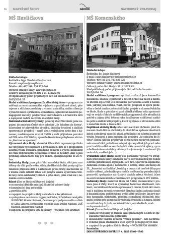 14 MATE%u0158SK%u00c9 %u0160KOLY N%u00c1CHODSK%u00dd%u2009 ZPRAVODAJM%u0160 Havl%u00ed%u010dkovaZ%u00e1kladn%u00ed %u00fadaje: %u0158editelka: Mgr. Vendula Dra%u0161narov%u00e1E-mail: msplhov@msplhov.czTelefon: 491 427 248, 736 772 040Webov%u00e9 str%u00e1nky %u0161koly: www.msplhov.czCelkov%u00fd aktu%u00e1ln%u00ed po%u010det d%u011bt%u00ed k 31. 1. 2025: 99 P%u0159edpokl%u00e1dan%u00fd po%u010det p%u0159ij%u00edman%u00fdch d%u011bt%u00ed od %u0161koln%u00edho roku 2025/2026: 35%u0160koln%u00ed vzd%u011bl%u00e1vac%u00ed program: Za v%u0161%u00edm hledej slunce %u2013 program zam%u011b%u0159en%u00fd na environment%u00e1ln%u00ed v%u00fdchovu a pro%u017eitkov%u00e9 u%u010den%u00ed, p%u011bstujeme a skl%u00edz%u00edme produkty z vlastn%u00ed zahr%u00e1dky, na%u0161%u00edm c%u00edlem je vytv%u00e1%u0159et m%u00edsto s p%u0159%u00e1telskou atmosf%u00e9rou, uplat%u0148ovat modern%u00ed pedagogick%u00e9 metody, podporovat individualitu a kreativitu d%u011bt%u00ed a zapojovat rodi%u010de do %u017eivota mate%u0159sk%u00e9 %u0161koly.Nadstandardn%u00ed aktivity %u0161koly: p%u011bveck%u00fd sbor Plhov%u00e1%u010dek; jsme zapojeni do projektu %u010cesk%u00e9 obce sokolsk%u00e9 %u201eSe Sokolem do %u017eivota%u201c, %u00fa%u010dastn%u00edme se plaveck%u00e9ho v%u00fdcviku, %u0161koli%u010dky bruslen%u00ed a dal%u0161%u00edch sportovn%u00edch projekt%u016f %u2013 nap%u0159. den s volejbalem nebo den s h%u00e1zenou; nav%u0161t%u011bvujeme m%u00edstn%u00ed GVUN a r%u00e1di p%u0159ij%u00edm%u00e1me pozv%u00e1n%u00ed od ZU%u0160 nebo SV%u010c D%u00e9%u010dko; zprost%u0159edkov%u00e1v%u00e1me pohybovou aktivitu %u201eBav%u00edme se sportem%u201c.V%u00fdznamn%u00e9 akce %u0161koly: sbore%u010dek Plhov%u00e1%u010dek reprezentuje %u0161kolu na ve%u0159ejn%u00fdch vystoupen%u00edch a p%u0159ehl%u00eddk%u00e1ch, d%u011bti se s programem %u00fa%u010dastn%u00ed v%u00edt%u00e1n%u00ed ob%u010d%u00e1nk%u016f, po%u0159%u00e1d%u00e1me exkurze a v%u00fdlety, n%u011bkolikr%u00e1t do roka p%u0159ipravujeme setk%u00e1v%u00e1n%u00ed s rodi%u010di %u010di bes%u00eddky, d%u00e1le u n%u00e1s prob%u00edhaj%u00ed konzulta%u010dn%u00ed dny pro rodi%u010de, spolupracujeme se Z%u0160 Plhov.Podm%u00ednky %u0161koly: jsme p%u011btit%u0159%u00eddn%u00ed mate%u0159sk%u00e1 %u0161kola, d%u011bti jsou rozd%u011bleny do t%u0159%u00edd podle v%u011bku, t%u0159%u00eddy p%u0159ed%u0161koln%u00edch d%u011bt%u00ed poskytuj%u00ed intenzivn%u00ed p%u0159%u00edpravu d%u011bt%u00ed k n%u00e1stupu do prvn%u00ed t%u0159%u00eddy; nach%u00e1z%u00edme se v klidn%u00e9 %u010d%u00e1sti s%u00eddli%u0161t%u011b Plhov a k pobytu venku vyu%u017e%u00edv%u00e1me bl%u00edzk%u00e9 lesy nebo n%u00e1chodsk%u00fd z%u00e1mek a jeho okol%u00ed, jsme v%u0161ak ale i nedaleko centra m%u011bsta. R%u016fzn%u00e9 (%u010d%u00edm se %u0161kola odli%u0161uje od jin%u00fdch): stravov%u00e1n%u00ed d%u011bt%u00ed dle princip%u016f Skute%u010dn%u011b zdrav%u00e9 %u0161kolykonzulta%u010dn%u00ed dny pro rodi%u010deportfolia d%u011bt%u00edzapojen%u00ed do projektu Mal%u00fd zahradn%u00edk a Recyklohran%u00ed spolupr%u00e1ce s neziskovou organizac%u00ed Sidus, St%u0159ediskem ran%u00e9 p%u00e9%u010de SLUN%u00cd%u010cKO Hradec Kr%u00e1lov%u00e9, Centrem pro podporu rodin a d%u00edt%u011bte LIRA Liberec, St%u0159ediskem voln%u00e9ho %u010dasu D%u00e9%u010dko N%u00e1chod, ZU%u0160 N%u00e1chod, knihovnou N%u00e1chodzapojen%u00ed do projektu SOS do %u0161kolky %u2013 WOMEN FOR WOMEN* * *M%u0160 Komensk%u00e9hoZ%u00e1kladn%u00ed %u00fadaje:%u0158editelka: Bc. Lucie Bla%u017ekov%u00e1E-mail: lucie.blazkova@mskomenskeho.czTelefon: 499 110 210, 733 685 322Webov%u00e9 str%u00e1nky %u0161koly: www.mskomenskeho.czCelkov%u00fd po%u010det d%u011bt%u00ed %u0161koly k 31. 1. 2025: 82P%u0159edpokl%u00e1dan%u00fd po%u010det p%u0159ij%u00edman%u00fdch d%u011bt%u00ed od %u0161koln%u00edho roku 2025/2026: 36%u0160koln%u00ed vzd%u011bl%u00e1vac%u00ed program: vych%u00e1z%u00ed z odkaz%u016f Jana %u00c1mose Komensk%u00e9ho, snahou je p%u011bstovat v d%u011btech hrdost na m%u00edsto a m%u011bsto, ve kter%u00e9m %u017eij%u00ed a v%u00e9st je k zdrav%u00e9mu patriotismu a %u00fact%u011b k hodnot%u00e1m, jak%u00fdmi jsou rodina, vlast, n%u00e1rod; program se op%u00edr%u00e1 p%u0159edev%u0161%u00edm o %u010desk%u00e9 tradice; celoro%u010dn%u00ed %u0161koln%u00ed projekt s n%u00e1zvem Poh%u00e1dka ve %u0161kole, %u0161kola v poh%u00e1dce si pan%u00ed u%u010ditelky b%u011bhem roku zpracov%u00e1vaj%u00ed ve sv%u00fdch t%u0159%u00eddn%u00edch vzd%u011bl%u00e1vac%u00edch programech dle aktu%u00e1ln%u00edch pot%u0159eb a z%u00e1jmu d%u011bt%u00ed; b%u011bhem roku dopl%u0148ujeme vzd%u011bl%u00e1vac%u00ed nab%u00eddku je%u0161t%u011b o dal%u0161%u00ed krat%u0161%u00ed projekty, kter%u00e9 vyplynou z aktu%u00e1ln%u00edho d%u011bn%u00ed v mate%u0159sk%u00e9 %u0161kole a %u017eivota d%u011bt%u00ed.Dopl%u0148kov%u00e9 aktivity %u0161koly: %u00fa%u010dast d%u011bt%u00ed na v%u00edt%u00e1n%u00ed ob%u010d%u00e1nk%u016f, p%u0159ed V%u00e1nocemi chod%u00ed d%u011bti na obch%u016fzky do okol%u00ed M%u0160 se zp%u011bvem v%u00e1no%u010dn%u00edch koled a p%u0159ed%u00e1vaj%u00ed v%u00e1no%u010dn%u00ed p%u0159%u00e1n%u00ed, p%u0159ed%u0161kol%u00e1ci se %u00fa%u010dastn%u00ed plaveck%u00e9 v%u00fduky, bruslen%u00ed a jsou zapojeni do projektu %u201eSe sokolem do %u017eivota%u201c; %u0161koln%u00ed j%u00eddelna p%u0159ipravuje ochutn%u00e1vku zdrav%u00fdch pomaz%u00e1nek a mou%u010dn%u00edk%u016f, po%u0159%u00e1d%u00e1me ve%u0159ejn%u00e9 v%u00fdstavy d%u011btsk%u00fdch prac%u00ed nebo prac%u00ed rodi%u010d%u016f a d%u011bt%u00ed ve vestibulu M%u0160, d%u00e1le tematick%u00e9 v%u00fdlety, zprost%u0159edkov%u00e1v%u00e1me n%u00e1v%u0161t%u011bvy n%u011bkter%u00fdch v%u00fdznamn%u00fdch osobnost%u00ed (liter%u00e1rn%u00edch, um%u011bleck%u00fdch%u2026).V%u00fdznamn%u00e9 akce %u0161koly: ka%u017ed%u00fd rok po%u0159%u00e1d%u00e1me v%u00fdstavy ve vstupn%u00edch prostor%u00e1ch %u0161koly, zahradn%u00ed party s %u017eivou hudbou pr