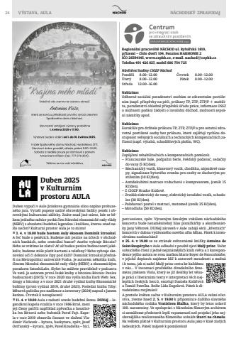 24 V%u00ddSTAVA, AULA N%u00c1CHODSK%u00dd ZPRAVODAJDuben 2025 v Kulturn%u00edm prostoru AULADuben vypu%u010d%u00ed v Aule Jir%u00e1skova gymn%u00e1zia silou naplno probuzen%u00e9ho jara. Vyra%u0161%u00ed pupeny nalit%u00e9 obrovsk%u00fdmi bal%u00edky pen%u011bz i obrovsk%u00fdmi kulturn%u00edmi z%u00e1%u017eitky. Zn%u00e1te snad jin%u00e9 m%u00edsto, kde se b%u011bhem jedin%u00e9ho m%u011bs%u00edce potk%u00e1 %u010dlen N%u00e1rodn%u00ed ekonomick%u00e9 rady vl%u00e1dy (NERV) s absolutn%u00ed hudebn%u00ed legendou i kn%u00ed%u017ekou, kterou snad ne%u0161lo ne%u010d%u00edst? Kulturn%u00ed prostor Aula je to m%u00edsto! 3. 4. v 18.00 bude hostem Auly ekonom Dominik Stroukal. A %u0159e%u010d bude o pen%u011bz%u00edch. Budeme m%u00edt pen%u00edze na %u00fa%u010dtech v obchodn%u00edch bank%u00e1ch, nebo centr%u00e1ln%u00ed bance? Anebo vyhraje Bitcoin? Nebo se vr%u00e1t%u00edme ke zlatu? A%u0165 u%u017e budou pen%u00edze budoucnosti jak%u00e9koliv, budeme st%u00e1le platit kartami a telefony? Nebo vyhraje skenov%u00e1n%u00ed o%u010d%u00ed %u010di dokonce %u010dipy pod k%u016f%u017e%u00ed? Dominik Stroukal p%u0159edn%u00e1%u0161%u00ed na Metropolitn%u00ed univerzit%u011b Praha. Je autorem n%u011bkolika knih, %u010dlenem N%u00e1rodn%u00ed ekonomick%u00e9 rady vl%u00e1dy (NERV) a ekonomick%u00fdm poradcem SatoshiLabs. Sly%u0161et ho m%u016f%u017eete pravideln%u011b v podcastu Ve vat%u011b. Je autorem prvn%u00ed %u010desk%u00e9 knihy o bitcoinu Bitcoin: Pen%u00edze budoucnosti (2015). V roce 2020 mu vy%u0161la kniha Dark Web: Sex, drogy a bitcoiny a v roce 2021 druh%u00e9 vyd%u00e1n%u00ed knihy Ekonomick%u00e9 bubliny (prvn%u00ed vyd%u00e1n%u00ed 2019, druh%u00e9 2021). Posledn%u00ed knihu Trhy: M%u011bnov%u00e1 politika pro nad%u0161ence a investory (2024) napsal s Janem Berkou. %u010ctvrtek k nezaplacen%u00ed! 11. 4. v 19.00 Aula s radost%u00ed uvede hudebn%u00ed ikonu. DUNAJ %u2013 legend%u00e1rn%u00ed kapela vznikla v roce 1986 Brn%u011b, mezi jej%u00ed %u010dleny pat%u0159ili nap%u0159%u00edklad zp%u011bva%u010dka a houslistka Iva Bittov%u00e1 nebo buben%u00edk Pavel Fajt. Kapela v roce 2019 obnovila %u010dinnost ve slo%u017een%u00ed Vladim%u00edr V%u00e1clavek %u2013 kytara, baskytara, zp%u011bv, Josef Ost%u0159ansk%u00fd %u2013 kytara, zp%u011bv, Pavel Koudelka %u2013 bic%u00ed, \rajina m%u00e9ho ml%u00e1d%u00ed \Srde%u010dn%u011b v%u00e1s zveme na v%u00fdstavu obraz%u016fAnton%u00edna K%u0159%u00ed%u017ee,kter%u00e1 se kon%u00e1 u p%u0159%u00edle%u017eitosti prvn%u00edho v%u00fdro%u010d%u00ed otev%u0159en%u00edSpolkov%u00e9ho domu N%u00e1chod.Slavnostn%u00ed zah%u00e1jen%u00ed v%u00fdstavy prob%u011bhne1. kv%u011btna 2025 v 17:00.V%u00fdstava bude k vid%u011bn%u00ed od 1. do 19. kv%u011btna 2025.V s%u00e1le Spolkov%u00e9ho domu N%u00e1chod, Hurd%u00e1lkova 2171.Otev%u00edrac%u00ed doba: pond%u011bl%u00ed, st%u0159eda, p%u00e1tek 9:00%u201316:00.Sobota a ned%u011ble pouze po domluv%u011b s panemAnton%u00ednem K%u0159%u00ed%u017eem (tel.: 777 079 354).T%u011b%u0161%u00edme se na va%u0161i n%u00e1v%u0161t%u011bvu.\rajina m%u00e9ho ml%u00e1d%u00ed \\rajina m%u00e9ho ml%u00e1d%u00ed \Srde%u010dn%u011b v%u00e1s zveme na v%u00fdstavu obraz%u016fAnton%u00edna K%u0159%u00ed%u017ee,kter%u00e1 se kon%u00e1 u p%u0159%u00edle%u017eitosti prvn%u00edho v%u00fdro%u010d%u00ed otev%u0159en%u00edSpolkov%u00e9ho domu N%u00e1chod.Slavnostn%u00ed zah%u00e1jen%u00ed v%u00fdstavy prob%u011bhne1. kv%u011btna 2025 v 17:00.T%u011b%u0161%u00edme se na va%u0161i n%u00e1v%u0161t%u011bvu.V%u00fdstava bude k vid%u011bn%u00ed od 1. do 19. kv%u011btna 2025.V s%u00e1le Spolkov%u00e9ho domu N%u00e1chod, Hurd%u00e1lkova 2171.Otev%u00edrac%u00ed doba: pond%u011bl%u00ed, st%u0159eda, p%u00e1tek 9:00%u201316:00.Sobota a ned%u011ble pouze po domluv%u011b s panemAnton%u00ednem K%u0159%u00ed%u017eem (tel.: 777 079 354).Region%u00e1ln%u00ed pracovi%u0161t%u011b N%u00c1CHOD ul. Ryb%u00e1%u0159sk%u00e1 1819, p%u0159%u00edzem%u00ed %u2013 %u010d%u00edslo dve%u0159%u00ed 104, Penzion HARMONIE 2I%u010cO 26594145, www.czphk.cz, e-mail. nachod@czphk.czTelefon 491 426 027, mobil 606 754 725N%u00e1v%u0161t%u011bvn%u00ed hodiny CIOZP N%u00e1chodPond%u011bl%u00ed 8.00%u201312.00 %u010ctvrtek 8.00%u201312.00 %u00dater%u00fd 8.00%u201312.00 P%u00e1tek 8.00%u201312.00 St%u0159eda 12.00%u201316.00Nab%u00edz%u00edme: Odborn%u00e9 soci%u00e1ln%u00ed poradenstv%u00ed osob%u00e1m se zdravotn%u00edm posti%u017een%u00edm (nap%u0159. p%u0159%u00edsp%u011bvky na p%u00e9%u010di, pr%u016fkazy TP, ZTP, ZTP/P + mobilita, poradenstv%u00ed ohledn%u011b p%u0159%u00edsp%u011bvk%u016f %u00fa%u0159adu pr%u00e1ce, informace OSSZ o mo%u017enosti pod%u00e1n%u00ed %u017e%u00e1dosti o invalidn%u00ed d%u016fchod, mo%u017enosti seps%u00e1n%u00ed n%u00e1mitky apod.Nab%u00edz%u00edme:Eurokl%u00ed%u010de pro dr%u017eitele pr%u016fkazu TP, ZTP, ZTP/P a pro ostatn%u00ed zdravotn%u011b posti%u017een%u00e9 osoby bez pr%u016fkazu, kter%u00e9 zaji%u0161%u0165uj%u00ed rychlou dostupnost ve%u0159ejn%u00fdch soci%u00e1ln%u00edch a technick%u00fdch kompenza%u010dn%u00edch za%u0159%u00edzen%u00ed (nap%u0159. v%u00fdtah%u016f, schodi%u0161%u0165ov%u00fdch plo%u0161in, WC).Nab%u00edz%u00edme:Zap%u016fj%u010den%u00ed rehabilita%u010dn%u00edch a kompenza%u010dn%u00edch pom%u016fcek.%u2013 Francouzsk%u00e9 hole, podpa%u017en%u00ed berle, %u0161v%u00e9dsk%u00fd podava%u010d, seda%u010dky do vany (5 K%u010d/den).%u2013 Mechanick%u00fd voz%u00edk, klozetov%u00fd voz%u00edk, chod%u00edtka, n%u00e1jezdov%u00e9 rampy, signalizace bytov%u00e9ho zvonku pro osoby se sluchov%u00fdm posti%u017een%u00edm (10 K%u010d/den).%u2013 Antidekubitn%u00ed matrace vzduchov%u00e9 s kompresorem, (cen%u00edk 15 K%u010d/den).%u2013 Z CIOZP Hradce Kr%u00e1lov%u00e9.%u2013 Zved%u00e1k elektrick%u00fd do vany, elektrick%u00fd invalidn%u00ed voz%u00edk, schodolez (30 K%u010d/den).%u2013 Polohovac%u00ed postel s matrac%u00ed, motomed (cen%u00edk 35 K%u010d/den).%u2013 Motodlaha (50 K%u010d/den).percussions, zp%u011bv. V