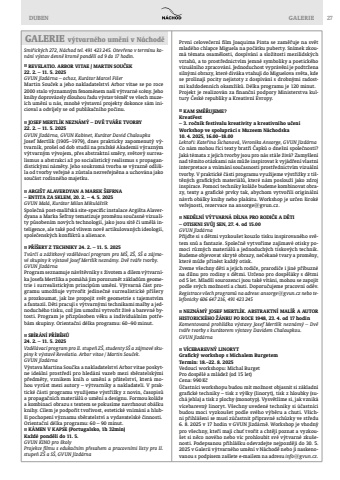 DUBEN GALERIE 27GALERIE v%u00fdtvarn%u00e9ho um%u011bn%u00ed v N%u00e1chod%u011bSmi%u0159ick%u00fdch 272, N%u00e1chod tel. 491 423 245. Otev%u0159eno v term%u00ednu kon%u00e1n%u00ed v%u00fdstav denn%u011b krom%u011b pond%u011bl%u00ed od 9 do 17 hodin. REVELATIO. ARBOR VITAE / MARTIN SOU%u010cEK22. 2. %u2013 11. 5. 2025GVUN J%u00edzd%u00e1rna %u2013 ochoz, Kur%u00e1tor Marcel Fi%u0161erMartin Sou%u010dek a jeho nakladatelstv%u00ed Arbor vitae se po roce 2000 stalo v%u00fdznamn%u00fdm fenom%u00e9nem na%u0161%u00ed v%u00fdtvarn%u00e9 sc%u00e9ny. Jeho knihy doprov%u00e1zely dlouhou %u0159adu v%u00fdstav t%u00e9m%u011b%u0159 ve v%u0161ech muze%u00edch um%u011bn%u00ed u n%u00e1s, mnoh%u00e9 v%u00fdstavn%u00ed projekty dokonce s%u00e1m inicioval a odv%u00edjely se od publika%u010dn%u00edho po%u010dinu. JOSEF MERTL%u00cdK NEZN%u00c1M%u00dd %u2013 DV%u011a TV%u00c1%u0158E TVORBY22. 2. %u2013 11. 5. 2025GVUN J%u00edzd%u00e1rna, GVUN Kabinet, Kur%u00e1tor David ChaloupkaJosef Mertl%u00edk (1905%u20131979), dnes prakticky zapomenut%u00fd v%u00fdtvarn%u00edk, pro%u0161el od dob studi%u00ed na pra%u017esk%u00e9 Akademii v%u00fdrazn%u00fdm v%u00fdtvarn%u00fdm v%u00fdvojem, p%u0159es abstraktn%u00ed sm%u011bry, sv%u011btov%u00fd surrealismus a abstrakci a%u017e po socialistick%u00fd realismus s propagandistick%u00fdmi n%u00e1m%u011bty. Jeho soukrom%u00e1 tvorba se v%u00fdrazn%u011b odli%u0161ila od tvorby ve%u0159ejn%u00e9 a z%u016fstala nezve%u0159ejn%u011bna a uchov%u00e1na jako sou%u010d%u00e1st rodinn%u00e9ho majetku. ARGI%u0160T ALAVERDYAN A MAREK %u0160EFRNA %u2013 ENTITA ZA SKLEM, 20. 2. %u2013 4. 5. 2025GVUN Mal%u00e1, Kur%u00e1tor Milan Mikul%u00e1%u0161t%u00edkSpole%u010dn%u00e1 post-mal%u00ed%u0159sk%u00e1 site-specific instalace Argi%u0161ta Alaverdyana a Marka %u0160efrny tematizuje prom%u011bnu sou%u010dasn%u00e9 vizuality p%u016fsoben%u00edm nov%u00fdch technologi%u00ed, jako jsou s%u00edt%u011b %u010di um%u011bl%u00e1 inteligence, ale tak%u00e9 pod vlivem nov%u011b artikulovan%u00fdch ideologi%u00ed, spole%u010densk%u00fdch konflikt%u016f a alienace. P%u0158%u00cd%u0160ERY Z TECHNIKY 24. 2. %u2013 11. 5. 2025Tv%u016fr%u010d%u00ed a z%u00e1%u017eitkov%u00fd vzd%u011bl%u00e1vac%u00ed program pro M%u0160, Z%u0160, S%u0160 a z%u00e1jmov%u00e9 skupiny k v%u00fdstav%u011b Josef Mertl%u00edk nezn%u00e1my. Dv%u011b tv%u00e1%u0159e tvorby. GVUN J%u00edzd%u00e1rnaProgram seznamuje n%u00e1v%u0161t%u011bvn%u00edky s %u017eivotem a d%u00edlem v%u00fdtvarn%u00edka Josefa Mertl%u00edka a pom%u00e1h%u00e1 jim porozum%u011bt z%u00e1klad%u016fm geometrie i surrealistick%u00fdm princip%u016fm um%u011bn%u00ed. V%u00fdtvarn%u00e1 %u010d%u00e1st programu umo%u017e%u0148uje vytvo%u0159it jedine%u010dn%u00e9 surrealistick%u00e9 p%u0159%u00ed%u0161ery a prozkoumat, jak lze propojit sv%u011bt geometrie s tajemstv%u00edm a fantazi%u00ed. D%u011bti pracuj%u00ed s v%u00fdtvarn%u00fdmi technikami malby a jednoduch%u00e9ho tisku, co%u017e jim umo%u017en%u00ed vytvo%u0159it %u017eiv%u00e9 a barevn%u00e9 bytosti. Program je p%u0159izp%u016fsoben v%u011bku a individu%u00e1ln%u00edm pot%u0159eb%u00e1m skupiny. Orienta%u010dn%u00ed d%u00e9lka programu: 60%u201390 minut. SB%u00cdR%u00c1N%u00cd P%u0158%u00cdB%u011aH%u016e24. 2. %u2013 11. 5. 2025Vzd%u011bl%u00e1vac%u00ed program pro II. stupe%u0148 Z%u0160, studenty S%u0160 a z%u00e1jmov%u00e9 skupiny k v%u00fdstav%u011b Revelatio. Arbor vitae / Martin Sou%u010dek. GVUN J%u00edzd%u00e1rna V%u00fdstava Martina Sou%u010dka a nakladatelstv%u00ed Arbor vitae poskytne ide%u00e1ln%u00ed prost%u0159ed%u00ed pro hled%u00e1n%u00ed vazeb mezi sb%u011bratelsk%u00fdmi p%u0159edm%u011bty, vznikem knih o um%u011bn%u00ed a p%u0159%u00e1telstv%u00ed, kter%u00e1 mohou vyr%u016fst mezi autory %u2013 v%u00fdtvarn%u00edky a nakladateli. V praktick%u00e9 %u010d%u00e1sti programu vyu%u017eijeme v%u00fdst%u0159i%u017eky z novin, %u010dasopis%u016f a propaga%u010dn%u00edch materi%u00e1l%u016f o um%u011bn%u00ed a designu. Formou kol%u00e1%u017ee a kombinac%u00ed obrazu s textem se pokus%u00edme navrhnout ob%u00e1lku knihy. C%u00edlem je podpo%u0159it tvo%u0159ivost, estetick%u00e9 vn%u00edm%u00e1n%u00ed a hlub%u0161%u00ed pochopen%u00ed v%u00fdznamu sb%u011bratelstv%u00ed a vydavatelsk%u00e9 %u010dinnosti.Orienta%u010dn%u00ed d%u00e9lka programu: 60 %u2013 90 minut. K%u00c1MEN V KAPSE (Portugalsko, 1h 32min)Ka%u017ed%u00e9 pond%u011bl%u00ed do 11. 5. GVUN KINO pro %u0161kolyProjekce filmu s eduka%u010dn%u00edm p%u0159esahem a pracovn%u00edmi listy pro II. stupe%u0148 Z%u0160 a S%u0160, GVUN J%u00edzd%u00e1rnaPrvn%u00ed celove%u010dern%u00ed film Joaquima Pinta se zam%u011b%u0159uje na sv%u011bt mlad%u00e9ho chlapce Miguela na po%u010d%u00e1tku puberty. Sn%u00edmek zkoum%u00e1 t%u00e9mata osam%u011blosti, dosp%u00edv%u00e1n%u00ed a slo%u017eitosti mezilidsk%u00fdch vztah%u016f, a to prost%u0159ednictv%u00edm jemn%u00e9 symboliky a poetick%u00e9ho vizu%u00e1ln%u00edho zpracov%u00e1n%u00ed. Jednoduchost vypr%u00e1v%u011bn%u00ed je podtr%u017eena siln%u00fdmi obrazy, kter%u00e9 div%u00e1ka vtahuj%u00ed do Miguelova sv%u011bta, kde se prol%u00ednaj%u00ed pocity nejistoty z dosp%u00edv%u00e1n%u00ed s drobn%u00fdmi radostmi ka%u017edodenn%u00edch okam%u017eik%u016f. D%u00e9lka programu je 120 minut.Projekt je realizov%u00e1n za finan%u010dn%u00ed podpory Ministerstva kultury %u010cesk%u00e9 republiky a Kreativn%u00ed Evropy. KAM SM%u011a%u0158UJEME?KreatFest %u2013 3. ro%u010dn%u00edk festivalu kreativity a kreativn%u00edho u%u010den%u00edWorkshop ve spolupr%u00e1ci s Muzeem N%u00e1chodska 10. 4. 2025, 16.00%u201318.00Lekto%u0159i: Kate%u0159ina %u0160ichanov%u00e1, Veronika Ansorge, GVUN J%u00edzd%u00e1rnaCo n%u00e1m mohou %u0159%u00edci texty brat%u0159%u00ed %u010capk%u016f o dne%u0161n%u00ed spole%u010dnosti? Jak%u00e1 t%u00e9mata z jejich tvorby jsou pro n%u00e1s st%u00e1le %u017eiv%u00e1? Zamy%u0161len%u00ed nad t%u011bmito ot%u00e1zkami n%u00e1s m%u016f%u017ee inspirovat k vyj%u00e1d%u0159en%u00ed v