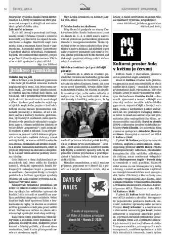 14 %u0160KOLY, AULA N%u00c1CHODSK%u00dd%u2009 ZPRAVODAJNejlep%u0161%u00edho v%u00fdsledku dos%u00e1hl Patrik Mitterwald ze 3.S, kter%u00fd se um%u00edstil na t%u0159et%u00ed p%u0159%u00ed%u010dce ve sv%u00e9 kategorii a obh%u00e1jil tak sv%u00e9 um%u00edst%u011bn%u00ed z p%u0159edlo%u0148sk%u00e9ho roku.Zahrani%u010dn%u00ed exkurzeTi, co r%u00e1di cestuj%u00ed a pozn%u00e1vaj%u00ed ciz%u00ed kraje, mohli rovn%u011b%u017e v b%u0159eznu vyrazit s cestovn%u00ed kancel%u00e1%u0159%u00ed Jany Hutkov%u00e9 na z%u00e1jezd do Amsterdamu a Anglie. Nav%u0161t%u00edvili nap%u0159. tato m%u00edsta: d%u016fm a muzeum Anne Frank v Amsterdamu, historick%u00e9 m%u011bsto Canterbury, v Lond%u00fdn%u011b zhl%u00e9dli Whitehall, Parlament, Big Ben, Westminstersk%u00e9 opatstv%u00ed, projeli se po Tem%u017e%u00ed i lond%u00fdnsk%u00fdm metrem. V%u0161ichni se vr%u00e1tili spokojeni a plni z%u00e1%u017eitk%u016f. Mgr. Lea Z%u00e1li%u0161ov%u00e1Vel%u0161sk%u00e9 dny na JGNM%u011bs%u00edc b%u0159ezen je na Jir%u00e1skov%u011b gymn%u00e1ziu v N%u00e1chod%u011b ji%u017e tradi%u010dn%u011b v%u011bnov%u00e1n kultu%u0159e anglojazy%u010dn%u00fdch zem%u00ed. Ani letos tomu nebylo jinak. %u201e%u010cerven%u00fd drak%u201c jako%u017eto n%u00e1rodn%u00ed symbol Walesu ovl%u00e1dl na%u0161i %u0161kolu, jak vizu%u00e1ln%u011b, tak i prost%u0159ednictv%u00edm tematick%u00fdch aktivit, interaktivn%u00edch workshop%u016f a d%u00edlen. Studenti pod veden%u00edm sv%u00fdch vyu%u010duj%u00edc%u00edch anglick%u00e9ho jazyka v hodin%u00e1ch b%u011bhem cel%u00e9ho m%u011bs%u00edce prezentovali r%u016fznorod%u00e9 poznatky o Walesu, a%u0165 u%u017e z oblasti jazyka a kultury, historie, gastronomie, v%u00fdznamn%u00fdch osobnost%u00ed, nebo sportu. P%u0159esto%u017ee v%u0161e prob%u00edhalo v%u00fdhradn%u011b v anglick%u00e9m jazyce, s t%u00edmto nelehk%u00fdm %u00fakolem se velice dob%u0159e %u201epopasovali%u201c i na%u0161i nejmlad%u0161%u00ed studenti z prim a sekund. Ti na sv%u00e9 prezentace za pomoci rodi%u010d%u016f dokonce p%u0159ipravili ochutn%u00e1vku vel%u0161sk%u00e9 dobroty zvan%u00e9 vel%u0161sk%u00fd kol%u00e1%u010d, za kterou sklidili zaslou%u017eenou chv%u00e1lu. Nezah%u00e1leli ani ostatn%u00ed studenti, a krom%u011b budouc%u00edch maturant%u016f, kte%u0159%u00ed se ji%u017e piln%u011b p%u0159ipravuj%u00ed na zkou%u0161ku z dosp%u011blosti, se na akci velmi aktivn%u011b pod%u00edlely v%u0161echny ro%u010dn%u00edky.Cel%u00e1 %u0161kola se v r%u00e1mci ka%u017edoro%u010dn%u00edch tematick%u00fdch dn%u016f letos od%u011bla do %u017elut%u00fdch narcis%u016f, obr%u00e1zk%u016f tajemn%u00fdch hrad%u016f obklopen%u00fdch zelen%u00fdmi kopci s pasouc%u00edmi se ove%u010dkami, %u010derven%u00fdmi draky v r%u016fzn%u00fdch podob%u00e1ch a dal%u0161%u00edmi typick%u00fdmi symboly Walesu, je%u017e na%u0161i studenti vytvo%u0159ili na zahajovac%u00ed v%u00fdtvarn%u00e9 d%u00edln%u011b.N%u00e1sledovalo tematick%u00e9 prom%u00edt%u00e1n%u00ed, p%u0159i n%u011bm%u017e se mlad%u0161%u00ed studenti sezn%u00e1mili s d%u00edlem vynikaj%u00edc%u00edho vel%u0161sk%u00e9ho spisovatele Roalda Dahla a star%u0161%u00ed se zam%u011b%u0159ili na anal%u00fdzu probl%u00e9m%u016f dosp%u00edvaj%u00edc%u00ed ml%u00e1de%u017ee. Velmi %u00fasp%u011b%u0161n%u00e9 bylo tak%u00e9 sportovn%u00ed kl%u00e1n%u00ed v bezkontaktn%u00edm ragby, ve kter%u00e9m se studenti ni%u017e%u0161%u00edho gymn%u00e1zia utkali jako prav%u00ed vel%u0161%u0161t%u00ed draci. N%u00e1dhernou te%u010dkou za v%u0161emi aktivitami byl vynikaj%u00edc%u00ed workshop vel%u0161tiny.R%u00e1da bych t%u00edmto pod%u011bkovala v%u0161em kolegyn%u00edm a koleg%u016fm, kte%u0159%u00ed pom%u00e1hali s organizac%u00ed Vel%u0161sk%u00fdch dn%u016f, podpo%u0159ili jejich kon%u00e1n%u00ed a hladk%u00fd pr%u016fb%u011bh, a hlavn%u011b v%u0161em student%u016fm, kte%u0159%u00ed k nim p%u0159istupovali vesele a s otev%u0159enou mysl%u00ed.Mgr. Lenka Hronkov%u00e1 za kabinet jazyk%u016f (red. kr%u00e1c.)V Doln%u00edm Sasku na zku%u0161enouD%u00edky finan%u010dn%u00ed podpo%u0159e ze strany %u010cesko-n%u011bmeck%u00e9ho fondu budoucnosti jsme ve dnech 26. 3.%u20132. 4. 2025 znovu nav%u0161t%u00edvili sv%u00e9 p%u0159%u00e1tele na partnersk%u00e9m gymn%u00e1ziu Oesede v Georgsmarienh%u00fctte. Tento v%u00fdm%u011bnn%u00fd pobyt se letos uskute%u010dnil po dvaat%u0159ic%u00e1t%u00e9 a znovu dok%u00e1zal, jak d%u016fle%u017eit%u00e9 je pro na%u0161e studenty pozn%u00e1vat ciz%u00ed zem%u011b z trochu jin%u00e9ho pohledu ne%u017e b%u011b%u017en%u00ed turist%u00e9, co%u017e dokazuj%u00ed i pozitivn%u00ed ohlasy na%u0161ich z%u00fa%u010dastn%u011bn%u00fdch student%u016f. N%u00e1v%u0161t%u011bva Osv%u011btimi %u2013 je i pro citliv%u011bj%u0161%u00ed povahy?V pond%u011bl%u00ed 24. 2. 2025 se studenti posledn%u00edho ro%u010dn%u00edku n%u00e1chodsk%u00e9ho gymn%u00e1zia z%u00fa%u010dastnili exkurze do Osv%u011btimi a n%u00e1sledn%u011b tak%u00e9 do m%u011bsta Krakova, kter%u00e9, jak jsme se po cest%u011b dozv%u011bd%u011bli, b%u00fdvalo d%u0159%u00edve hlavn%u00edm m%u011bstem Polska. Ne v%u0161ichni si ale p%u0159%u00e1li na exkurzi jet, a dle m%u00e9ho odhadu to nebylo t%u00edm, %u017ee by necht%u011bli vid%u011bt krakovsk%u00e9 kostely a baziliky, nebo proto, %u017ee by Jir%u00e1skovo gymn%u00e1ziumnecht%u011bli ochutnat lahodn%u00e9 polsk%u00e9 koblihy. Sp%u00ed%u0161e je d%u011bsila prvn%u00ed %u010d%u00e1st exkurze %u2013 Osv%u011btim. %u201eJsem velmi citliv%u00e1 a nav%u0161t%u00edvit m%u00edsto, kde trp%u011bly a zem%u0159ely spousty lid%u00ed, by mi p%u016fsobilo velkou psychickou a pravd%u011bpodobn%u011b i fyzickou bolest,%u201c %u0159ekla mi kamar%u00e1dka Eli%u0161ka.Minulost nezm%u011bn%u00edme, a tak ji mus%u00edme p%u0159ijmout, posunout se v %u017eivot%u011b d%u00e1l a pou%u010dit se z omyl%u016f vlastn%u00edch i ciz%u00edch, aby se Kv%u011bten bude v Kulturn%u00edm prostoru AULA pom%u011brn%u011b anglo-americk%u00fd.Hned 2. kv%u011btna ovl%u00e1dne Aulu Jir%u00e1skova gymn%u00e1zia s