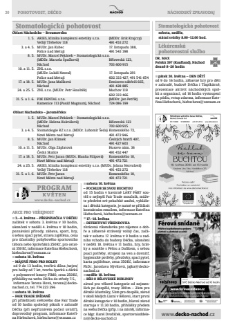 30 POHOTOVOST, D%u00c9%u010cKO N%u00c1CHODSK%u00dd ZPRAVODAJStomatologick%u00e1 pohotovostsobota, ned%u011ble, st%u00e1tn%u00ed sv%u00e1tky 8.00%u201312.00 hod.Stomatologick%u00e1 pohotovostL%u00e9k%u00e1rensk%u00e1 pohotovostn%u00ed slu%u017eba www.decko-nachod.czDR. MAXPolsk%u00e1 397 (Kaufland), N%u00e1choddenn%u011b 8%u201320 hodinKV%u011aTENPROGRAMwww.decko%u2013nachod.czAKCE PRO VE%u0158EJNOST3.%u20134. kv%u011btna %u2013 P%u0158ESP%u00c1VA%u010cKA V D%u00c9%u010cKU za%u010d%u00e1tek v sobotu 3. kv%u011btna v 10 hodin, ukon%u010den%u00ed v ned%u011bli 4. kv%u011btna v 10 hodin, pozn%u00e1v%u00e1n%u00ed p%u0159%u00edrody, z%u00e1bava, sport, hry, s sebou spac%u00ed pytel, strava zaji%u0161t%u011bna, cena pro %u00fa%u010dastn%u00edky pohybov%u00e9ho sportovn%u00edho t%u00e1bora nebo Spr%u00e1v%u0148%u00e1k%u016f 250K%u010d, pro ostatn%u00ed 350K%u010d, informace Kate%u0159ina Hiebschov%u00e1, hiebschova@seznam.czsobota 10. kv%u011btna %u2013 M%u00c1JOV%u00c9 FIMO PRO HOLKY od 9 do 13 hodin, tvo%u0159iv%u00e1 d%u00edlna /nejen/ pro holky od 7 let, tvorba %u0161perk%u016f a d%u00e1rk%u016f  z polymerov%u00e9 hmoty FIMO, cena 250K%u010d, p%u0159ihl%u00e1%u0161ky na webu D%u00e9%u010dka do st%u0159edy 7.5.,  informace Tereza I%u0161ov%u00e1, tereza@deckonachod.cz, tel. 774 223 296sobota 10. kv%u011btna %u2013 FAIR TRADE SN%u00cdDAN%u011ap%u0159i p%u0159%u00edle%u017eitosti sv%u011btov%u00e9ho dne Fair Trade od 10 hodin spole%u010dn%u00fd piknik v zahrad%u011b D%u00e9%u010dka (p%u0159i nep%u0159%u00edzniv%u00e9m po%u010das%u00ed uvnit%u0159), doprovodn%u00fd program, informace Kate%u0159ina Hiebschov%u00e1, hiebschova@seznam.czsobota 10. kv%u011btna %u2013 POCHLUB SE SVOU BUCHTOUod 15 hodin v kav%u00e1rn%u011b L%u00c1RY F%u00c1RY sout%u011b%u017e o nejlep%u0161%u00ed Fair Trade mou%u010dn%u00edk, m%u016f%u017eete p%u0159edv%u00e9st sv%u00e9 peka%u0159sk%u00e9 um%u011bn%u00ed, vyhl%u00e1%u0161ena i d%u011btsk%u00e1 kategorie, je nutn%u00e9 se p%u0159ihl%u00e1sit kontaktn%u00edm emailem, informace Kate%u0159ina Hiebschov%u00e1, hiebschova@seznam.cz17.%u201318. kv%u011btna %u2013 DETEKTIVN%u00cd V%u00cdKENDOVKA zkr%u00e1cen%u00e1 v%u00edkendovka pro z%u00e1jemce o dob%u0159e a z%u00e1bavn%u011b str%u00e1ven%u00fd voln%u00fd %u010das, za%u010d%u00e1tek v sobotu 17. kv%u011btna v 9 hodin u zadn%u00edho vchodu do budovy D%u00e9%u010dka, ukon%u010den%u00ed v ned%u011bli 18. kv%u011btna v 11 hodin, hry, hr%u00e1tky a sout%u011b%u017ee s P%u00e9%u0165ou a Dal%u00edkem, s sebou psac%u00ed pot%u0159eby, strojen%u00ed na ven a dovnit%u0159, hygienick%u00e9 pot%u0159eby, p%u0159ez%u016fvky, spac%u00ed pytel, karta poji%u0161t%u011bnce, cena 350K%u010d, informace PhDr. Jaroslava N%u00fdvltov%u00e1, jajka@deckonachod.czned%u011ble 18. kv%u011btna %u2013 B%u011aH O B%u011aLOVESK%u00c9 BUBLINKYz%u00e1vod pro v%u011bkov%u00e9 kategorie od nejmen%u0161%u00edch po dosp%u011bl%u00e9, trasy 300m %u2013 2 km pro d%u011btsk%u00e9 %u00fa%u010dastn%u00edky, 5 km pro dosp%u011bl%u00e9, z%u00e1vod v okol%u00ed Mal%u00fdch L%u00e1zn%u00ed v B%u011blovsi, start prvn%u00ed d%u011btsk%u00e9 kategorie v 10 hodin, hlavn%u00ed z%u00e1vod startuje v 11.30 hodin, p%u0159ihl%u00e1%u0161ky p%u0159edem na webu D%u00e9%u010dka (p%u0159%u00edp. i na m%u00edst%u011b), informace Mgr. Karel Dvo%u0159%u00e1%u010dek, sportovnioddeleni@decko-nachod.cz Oblast N%u00e1chodsko %u2013 Broumovsko:1. 5. ARIES, klinika komplexn%u00ed estetiky s.r.o. (MDDr. Erik Krajczy)Velk%u00fd T%u0159ebe%u0161ov 118 491 453 2723. a 4. 5. MUDr. Jan Kubec 17. listopadu 388, Police nad Metuj%u00ed 491 543 3988. 5. MUDr. Marcel Pek%u00e1rek %u2013 Stomatologick%u00e1 s.r.o. (MDDr. Marcela %u0160pa%u010dkov%u00e1) B%u011blovesk%u00e1 123,N%u00e1chod 703 600 91510. a 11. 5. ZNL s.r.o. (MUDr. Luk%u00e1%u0161 Neoral) 17. listopadu 291Police nad Metuj%u00ed 602 333 427, 491 541 65417. a 18. 5. MUDr. Jana Mal%u00edkov%u00e1 Denisovo n%u00e1b%u0159e%u017e%u00ed 665,N%u00e1chod 491 428 88524. a 25. 5. ZNL s.r.o. (MUDr. Petr Hou%u0161t%u011bk) Machov 119 602 333 46631. 5. a 1. 6. P3K DENTAL s.r.o. (MDDr. Jan Pet%u0159%u00edk)Kamenice 113 (Pas%u00e1%u017e Magnum), N%u00e1chod 724 086 199Oblast N%u00e1chodsko %u2013 Jarom%u011b%u0159sko:1. 5. MUDr. Marcel Pek%u00e1rek %u2013 Stomatologick%u00e1 s.r.o. (MDDr. Helena Kukr%u00e1lov%u00e1) B%u011blovesk%u00e1 123N%u00e1chod 703 600 9153. a 4. 5. Stomatologie RZ s.r.o. (MDDr. Lubom%u00edr %u0160eda) Komensk%u00e9ho 72,Nov%u00e9 M%u011bsto nad Metuj%u00ed 491 472 9468. 5. MUDr. Jan Klimek %u010cesk%u00fdch brat%u0159%u00ed 407,N%u00e1chod 491 427 60310. a 11. 5. MUDr. Olga Z%u00e1platov%u00e1 Husovo n%u00e1m. 36%u010cesk%u00e1 Skalice 491 452 44717. a 18. 5. MUDr. Petr Juran (MUDr. Blanka Filipov%u00e1) Komensk%u00e9ho 10,Nov%u00e9 M%u011bsto nad Metuj%u00ed 491 472 72124. a 25. 5. ARIES, klinika komplexn%u00ed estetiky s.r.o. (MUDr. Jolana Nezvalov%u00e1)Velk%u00fd T%u0159ebe%u0161ov 118 491 453 27231. 5. a 1. 6. MUDr. Petr Juran Komensk%u00e9ho 10,Nov%u00e9 M%u011bsto nad Metuj%u00ed 491 472 721p%u00e1tek 30. kv%u011btna %u2013 DEN D%u011aT%u00cdod 9 do 16 hodin, z%u00e1bavn%u00e9 hry pro d%u011bti v zahrad%u011b, budov%u011b D%u00e9%u010dka i Tlap%u00edk%u00e1rn%u011b, prezentace aktivit n%u00e1chodsk%u00fdch spolk%u016f a organizac%u00ed, od 16 hodin vystoupen%u00ed na p%u00f3diu, vstup zdarma, informace Kate%u0159ina Hiebschov%u00e1, hiebschova@seznam.cz