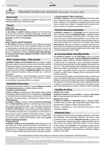 32 KNIHOVNA N%u00c1CHODSK%u00dd ZPRAVODAJPro aktu%u00e1ln%u00ed informace sledujte na%u0161e str%u00e1nky www.mknachod.cz nebo www.facebook.com/knihovnanachod.M%u011bstsk%u00e1 knihovna N%u00e1chod informuje v kv%u011btnu 2025M%u011bs%u00ed%u010dn%u00edk N%u00e1chodsk%u00fd zpravodaj. Vyd%u00e1v%u00e1 M%u011bsto N%u00e1chod, I%u010cO: 00272868, Masarykovo n%u00e1m%u011bst%u00ed 40, 547 01 N%u00e1chod. Odpov%u011bdn%u00fd redaktor: Nina Adlof. Redak%u010dn%u00ed rada: Ing. Jaroslav Rohul%u00e1n, Ing. Eva %u010cejchanov%u00e1, Hana Kopeck%u00e1, Bc. Martin Hurd%u00e1lek, Petr B%u0159enda a Mgr. V%u011bra Vl%u010dkov%u00e1. Fotografi e po%u0159%u00eddila redakce, auto%u0159i %u010dl%u00e1nk%u016f a archiv. Tituln%u00ed foto: Martin Hurd%u00e1lek. Grafi ck%u00e1 %u00faprava CREOPRESS, e-mail: studio@creopress.cz.%u010c%u00edslo 5/2025 vych%u00e1z%u00ed 30. 4. 2025. N%u00e1klad 5000 ks. Distribuce zdarma. Registrace: MK %u010cR E 11975. Za zm%u011bny v programech zodpov%u00eddaj%u00ed po%u0159adatel%u00e9 jednotliv%u00fdch akc%u00ed a po%u0159ad%u016f. P%u0159%u00edsp%u011bvky jsou v%u00edt%u00e1ny, nevy%u017e%u00e1dan%u00e9 se nevracej%u00ed. Neozna%u010den%u00e9 a nepodepsan%u00e9 p%u0159%u00edsp%u011bvky po%u0159%u00eddila redakce. Adresa %u010dasopisu: NZ, M%u011bstsk%u00fd %u00fa%u0159ad v N%u00e1chod%u011b, Masarykovo n%u00e1m%u011bst%u00ed 40, 547 01, tel./fax: 491 405 255, e-mail: zpravodaj@mestonachod.cz. Uz%u00e1v%u011brka tohoto %u010d%u00edsla byla 17. 4. 2025. Uz%u00e1v%u011brka %u010dervnov%u00e9ho %u010d%u00edsla bude 16. 5. 2025. Pros%u00edme o respektov%u00e1n%u00ed data uz%u00e1v%u011brky. D%u011bkujeme.Rozvoz knihV %u00fater%u00fd 6. kv%u011btna se v dopoledn%u00edch hodin%u00e1ch uskute%u010dn%u00ed rozvoz knih nemocn%u00fdm nebo star%u0161%u00edm ob%u010dan%u016fm.V%u00fdstavyVstupn%u00ed halaN%u00c1CHODSK%u00c1 PRIMA SEZ%u00d3NA4.%u201330. kv%u011btna. V ned%u011bli 4. kv%u011btna zah%u00e1j%u00edme 26. ro%u010dn%u00edk N%u00e1chodsk%u00e9 Prima sez%u00f3ny v%u00fdstavou sout%u011b%u017en%u00edch fotografi %u00ed. Vernis%u00e1%u017e, jej%u00ed%u017e sou%u010d%u00e1st%u00ed bude vystoupen%u00ed P%u011bveck%u00e9ho sboru student%u016f Jir%u00e1skova gymn%u00e1zia, prob%u011bhne v 15.00 hodin.StudovnaHANA TYL%u0160OV%u00c1: SKRYT%u00c9 KR%u00c1SNOSTI6.%u201330. kv%u011btna. Zku%u0161enou fotografku Hanu Tyl%u0161ovou p%u0159itahuje skryt%u00fd sv%u011bt detailu, barvy, tvary a zaj%u00edmav%u00e9 kompozice; inspiraci hled%u00e1 zejm%u00e9na v p%u0159%u00edrod%u011b. Bav%u00ed ji p%u0159etv%u00e1%u0159et realitu, %u010d%u00edm%u017e se st%u00e1v%u00e1 tv%u016frkyn%u00ed nov%u00fdch pohled%u016f vyvol%u00e1vaj%u00edc%u00edch emoce a %u00fa%u017eas nad kr%u00e1sou a originalitou stvo%u0159en%u00ed. V%u00fdstavu jej%u00edch makrofotografi %u00ed a ilustrovan%u00fdch b%u00e1sn%u00ed zah%u00e1j%u00edme vernis%u00e1%u017e%u00ed v %u00fater%u00fd 6. kv%u011btna od 17.30 hodin.NUV%u010c: Vladim%u00edr Ko%u0159en %u2013 %u0158eka z%u00e1zrak%u016f V pond%u011bl%u00ed 5. kv%u011btna se od 17.00 hodin t%u011b%u0161%u00edme na setk%u00e1n%u00ed s obl%u00edben%u00fdm moder%u00e1torem a populariz%u00e1torem v%u011bdy a %u017eivotn%u00edho prost%u0159ed%u00ed Vladim%u00edrem Ko%u0159enem. Vystudovan%u00e9ho %u017eurnalistu a dlouholet%u00e9ho redaktora %u010cesk%u00e9 televize m%u016f%u017eete zn%u00e1t zejm%u00e9na ze z%u00e1bavn%u00e9ho po%u0159adu Z%u00e1zraky p%u0159%u00edrody. Ve Spolkov%u00e9m dom%u011b bude vypr%u00e1v%u011bt nejen o z%u00e1%u017eitc%u00edch z nat%u00e1%u010den%u00ed a l%u00e1sce k p%u0159%u00edrod%u011b, ale i o nov%u00e9 roli spisovatele.P%u0159edn%u00e1%u0161ku po%u0159%u00e1d%u00e1me v r%u00e1mci N%u00e1chodsk%u00e9 univerzity voln%u00e9ho %u010dasu; vstupn%u00e9 pro ostatn%u00ed z%u00e1jemce %u010din%u00ed 70 K%u010d. Kapacita je omezen%u00e1, p%u0159edprodej vstupenek prob%u00edh%u00e1 ve studovn%u011b. N%u00e1chodsk%u00e1 Prima sez%u00f3naDo festivalu studentsk%u00e9 tvo%u0159ivosti se krom%u011b zahajovac%u00ed vernis%u00e1%u017ee s koncertem zapoj%u00edme i n%u011bkolika dal%u0161%u00edmi akcemi:Hrajeme pro %u0160kvoreck%u00e9hoV %u00fater%u00fd 6. kv%u011btna si p%u0159ipomeneme %u0160kvoreck%u00e9ho l%u00e1sku k hudb%u011b vystoupen%u00edm mlad%u00fdch saxofonist%u016f a saxofonistek. V 16.00 hodin na zahrad%u011b knihovny zahraj%u00ed z%u00e1stupci saxofonov%u00fdch t%u0159%u00edd ZU%u0160 N%u00e1chod, ZU%u0160 A. M. Buxton %u00dapice a ZU%u0160 St%u0159ezina z Hradce Kr%u00e1lov%u00e9. %u017div%u00e1 knihovnaVe st%u0159edu 7. kv%u011btna se mohou studenti od 9.00 do 12.00 hodin t%u011b%u0161it na %u017divou knihovnu. Jedn%u00e1 se o speci%u00e1ln%u00ed typ knihovny, kde jsou nam%u00edsto knih p%u016fj%u010dov%u00e1ni lid%u00e9 %u2013 tzv. %u017eiv%u00e9 knihy. %u010cten%u00ed prob%u00edh%u00e1 formou rozhovor%u016f, p%u0159i nich%u017e %u201cknihy%u201c nech%u00e1vaj%u00ed nahl%u00e9dnout %u010dten%u00e1%u0159e do sv%u00fdch p%u0159%u00edb%u011bh%u016f. I na%u0161e %u017div%u00e1 knihovna bude p%u0159%u00edle%u017eitost%u00ed k dozv%u00edd%u00e1n%u00ed se nov%u00fdch v%u011bc%u00ed a k zamy%u0161len%u00ed se nad r%u016fzn%u00fdmi t%u00e9maty. %u010cten%u00e1%u0159 si vybere %u201ckn%u00ed%u017eku%u201c podle kr%u00e1tk%u00e9 anotace, a pokud nen%u00ed zrovna %u201c%u010dtena%u201c n%u011bk%u00fdm jin%u00fdm, m%u016f%u017ee se do n%u00ed v %u010dasov%u011b omezen%u00e9 d%u00e9lce pustit. Z kapacitn%u00edch d%u016fvod%u016f je akce ur%u010dena pouze p%u0159edem objednan%u00fdm %u0161kol%u00e1m. %u0160achov%u00fd turnajVe st%u0159edu 7. kv%u011btna se od 14.30 hodin m%u016f%u017eete p%u0159ipojit ke %u010dlen%u016fm %u0160achov%u00e9ho krou%u017eku Jir%u00e1skova gymn%u00e1zia, kte%u0159%u00ed budou se z%u00e1jemci p%u0159ed knihovnou nebo ve vstupn%u00ed hale soub%u011b%u017en%u011b rozehr%u00e1vat n%u011bkolik parti%u00ed. V p%u0159%u00edpad%u011b p%u0159%u00edzniv%u00e9ho po%u010das%u00ed n%u00e1s %u010dek%u00e1 i uk%u00e1zkov%u00e1 hra na velk%u00fdch u