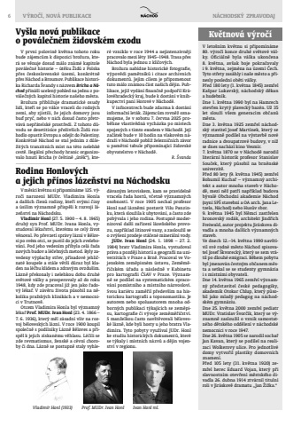 6 V%u00ddRO%u010c%u00cd, NOV%u00c1 PUBLIKACE N%u00c1CHODSK%u00dd%u2009 ZPRAVODAJKv%u011btnov%u00e1 v%u00fdro%u010d%u00edV leto%u0161n%u00edm kv%u011btnu si p%u0159ipom%u00edn%u00e1me 80. v%u00fdro%u010d%u00ed konce druh%u00e9 sv%u011btov%u00e9 v%u00e1lky. Ofici%u00e1ln%u011b byla v%u00e1lka ukon%u010dena 8. kv%u011btna, av%u0161ak boje pokra%u010dovaly i 9. kv%u011btna, zejm%u00e9na na %u00fazem%u00ed %u010cech. Tyto st%u0159ety zas%u00e1hly i na%u0161e m%u011bsto a p%u0159inesly posledn%u00ed ob%u011bti v%u00e1lky.P%u0159ed 180 lety (1. kv%u011btna 1845) zem%u0159el Ka%u0161par Lukavsk%u00fd, n%u00e1chodsk%u00fd d%u011bkan a hudebn%u00edk.Dne 1. kv%u011btna 1990 byl na Hamrech otev%u0159en kryt%u00fd plaveck%u00fd baz%u00e9n. U%u017e 35 let slou%u017e%u00ed v%u0161em generac%u00edm ob%u010dan%u016f m%u011bsta.Dne 3. kv%u011btna 1925 zem%u0159el n%u00e1chodsk%u00fd stavitel Josef Mart%u00ednek, kter%u00fd se v%u00fdznamn%u011b pod%u00edlel na v%u00fdstavb%u011b nov%u00e9 radnice a dvoupatrov%u00e9 budovy, v n%u00ed%u017e se dnes nach%u00e1z%u00ed kino Vesm%u00edr.7. kv%u011btna 1870 se v N%u00e1chod%u011b narodil liter%u00e1rn%u00ed historik profesor Stanislav Sou%u010dek, kter%u00fd p%u016fsobil na brn%u011bnsk%u00e9 univerzit%u011b.P%u0159ed 80 lety (9. kv%u011btna 1945) zem%u0159el Bohumil Kucha%u0159 %u2013 v%u00fdznamn%u00fd architekt a autor mnoha staveb v N%u00e1chod%u011b, mezi n%u011b%u017e pat%u0159%u00ed nap%u0159%u00edklad budova b%u00fdval%u00e9 Obchodn%u00ed akademie N%u00e1chod (nyn%u00ed SP%u0160 stavebn%u00ed a OA arch. Jana Letzela, N%u00e1chod) nebo Hus%u016fv sbor.9. kv%u011btna 1945 byl N%u011bmci zast%u0159elen hronovsk%u00fd rod%u00e1k, architekt Jind%u0159ich Freiwald, autor projektu Jir%u00e1skova divadla a mnoha dal%u0161%u00edch v%u00fdznamn%u00fdch staveb.Ve dnech 12.%u201314. kv%u011btna 1990 nav%u0161t%u00edvil sv%u00e9 rodn%u00e9 m%u011bsto N%u00e1chod spisovatel Josef %u0160kvoreck%u00fd, kter%u00fd se sem vr%u00e1til po dlouh%u00e9 emigraci. B%u011bhem pobytu byl jmenov%u00e1n %u010destn%u00fdm ob%u010danem m%u011bsta a setkal se se studenty gymn%u00e1zia i s m%u00edstn%u00edmi obyvateli.Dne 14. kv%u011btna 1965 zem%u0159el v%u00fdznamn%u00fd p%u0159edstavitel %u010desk%u00e9 pedagogiky, akademik Otokar Chlup, kter%u00fd p%u016fsobil jako mlad%u00fd pedagog na n%u00e1chodsk%u00e9m gymn%u00e1ziu.Dne 25. kv%u011btna 2000 zem%u0159el pediatr MUDr. Vratislav %u0160vor%u010d%u00edk, kter%u00fd se v%u00fdznamn%u011b zaslou%u017eil o vznik samostatn%u00e9ho d%u011btsk%u00e9ho odd%u011blen%u00ed v n%u00e1chodsk%u00e9 nemocnici v roce 1947.Dne 26. kv%u011btna 1905 se narodil socha%u0159 Jan Kavan, kter%u00fd se pod%u00edlel na realizaci Wolkerovy ulice. Pro jednotliv%u00e9 domy vytvo%u0159il plastiky domovn%u00edch znamen%u00ed.P%u0159ed 105 lety (31. kv%u011btna 1920) zem%u0159el herec Eduard Vojan, kter%u00fd p%u0159i slavnostn%u00edm otev%u0159en%u00ed m%u011bstsk%u00e9ho divadla 26. dubna 1914 ztv%u00e1rnil tituln%u00ed roli v Jir%u00e1skov%u011b dramatu %u201eJan %u017di%u017eka.%u201cV prvn%u00ed polovin%u011b kv%u011btna tohoto roku bude z%u00e1jemc%u016fm k dispozici bro%u017eura, kter%u00e1 se v%u011bnuje dosud m%u00e1lo zn%u00e1m%u00e9 kapitole pov%u00e1le%u010dn%u00e9 historie %u2013 %u00fat%u011bku %u017did%u016f z Polska p%u0159es %u010deskoslovensk%u00e9 %u00fazem%u00ed, konkr%u00e9tn%u011b p%u0159es N%u00e1chod a Broumov. Publikace historika Richarda %u0160vandy s n%u00e1zvem Bricha a N%u00e1chod p%u0159in%u00e1%u0161%u00ed ucelen%u00fd pohled na jednu z pov%u00e1le%u010dn%u00fdch kapitol historie na%u0161eho m%u011bsta. Bro%u017eura p%u0159ibli%u017euje dramatick%u00e9 osudy lid%u00ed, kte%u0159%u00ed se po v%u00e1lce vraceli do rodn%u00fdch zem%u00ed, aby zjistili, %u017ee jejich domovy jsou bu%u010f pry%u010d, nebo v nich dosud %u010dasto p%u0159etrv%u00e1v%u00e1 nep%u0159%u00e1telsk%u00e9 prost%u0159ed%u00ed. Z tohoto d%u016fvodu se desetitis%u00edce p%u0159e%u017eiv%u0161%u00edch %u017did%u016f rozhodlo opustit Evropu a odej%u00edt do Palestiny. Konkr%u00e9tn%u011b N%u00e1chod se stal jedn%u00edm z d%u016fle%u017eit%u00fdch tranzitn%u00edch m%u00edst na t%u00e9to nelehk%u00e9 cest%u011b. Ileg%u00e1ln%u00ed p%u0159echody hranic organizovalo hnut%u00ed Bricha (v %u010de%u0161tin%u011b %u201e%u00fat%u011bk%u201c), kteVy%u0161la nov%u00e1 publikace o pov%u00e1le%u010dn%u00e9m %u017eidovsk%u00e9m exodur%u00e9 vzniklo v roce 1944 a nejintenzivn%u011bji pracovalo mezi l%u00e9ty 1945%u20131948. Trasa p%u0159es N%u00e1chod byla jednou z kl%u00ed%u010dov%u00fdch. Bro%u017eura nab%u00eddne historick%u00e9 fotografie, v%u00fdpov%u011bdi pam%u011btn%u00edk%u016f i citace archivn%u00edch dokument%u016f. Jej%u00edm c%u00edlem je p%u0159ipomenout tuto m%u00e1lo zn%u00e1mou %u010d%u00e1st na%u0161ich d%u011bjin. Publikace, jej%u00ed%u017e vyd%u00e1n%u00ed finan%u010dn%u011b podpo%u0159il Kr%u00e1lov%u00e9hradeck%u00fd kraj, bude k dost%u00e1n%u00ed v knihkupectv%u00ed pan%u00ed Horov%u00e9 v N%u00e1chod%u011b. V infocentrech bude zdarma k dost%u00e1n%u00ed informa%u010dn%u00ed let%u00e1k. Z%u00e1jemc%u016fm rovn%u011b%u017e oznamujeme, %u017ee v sobotu 7. %u010dervna 2025 prob%u011bhne vlastiv%u011bdn%u00e1 vych%u00e1zka po m%u00edstech spojen%u00fdch s t%u00edmto exodem v N%u00e1chod%u011b. Jej%u00ed za%u010d%u00e1tek bude v 10 hodin na vlakov%u00e9m n%u00e1dra%u017e%u00ed v N%u00e1chod%u011b pobl%u00ed%u017e %u017eelezni%u010dn%u00edch z%u00e1vor u pam%u011btn%u00ed tabule p%u0159ipom%u00ednaj%u00edc%u00ed %u017eidovsk%u00e9 obyvatelstvo v N%u00e1chod%u011b. R. %u0160vandaV m%u011bs%u00edci kv%u011btnu si p%u0159ipom%u00edn%u00e1me 125. v%u00fdro%u010d%u00ed narozen%u00ed MUDr. Vladim%u00edra Honla a dal%u0161%u00edch %u010dlen%u016f rodiny, kte%u0159%u00ed sv%u00fdmi %u010diny a %u00fasil%u00edm v%u00fdznamn%u011b p%u0159isp%u011bli k rozvoji l%u00e1ze%u0148stv%u00ed na N%u00e1chodsku.Vladim%u00edr Honl (27. 5. 1900 %u2013 4. 8. 1965) druh%u00fd syn Prof. MU