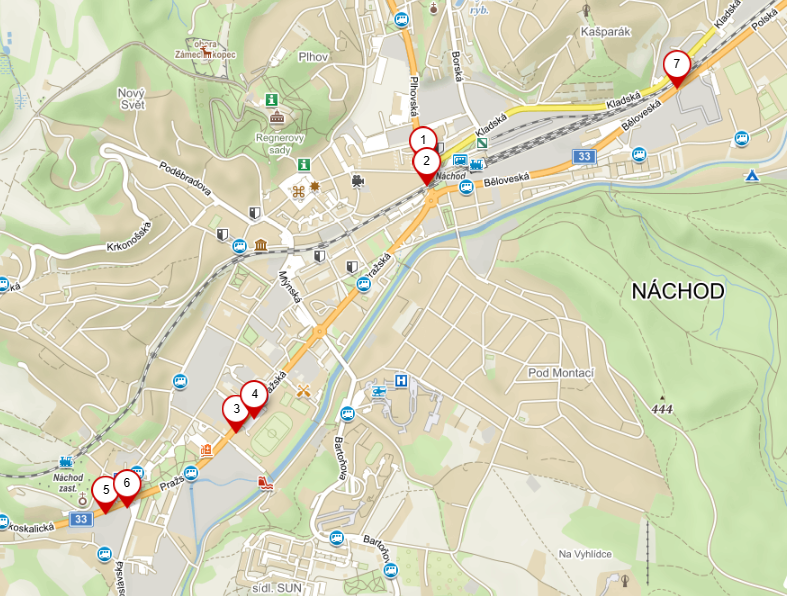 1. Kamenice (dům č. p. 155) - kruhový objezd Itálie, část směr k CDS , nádraží, část ulice Plhovská