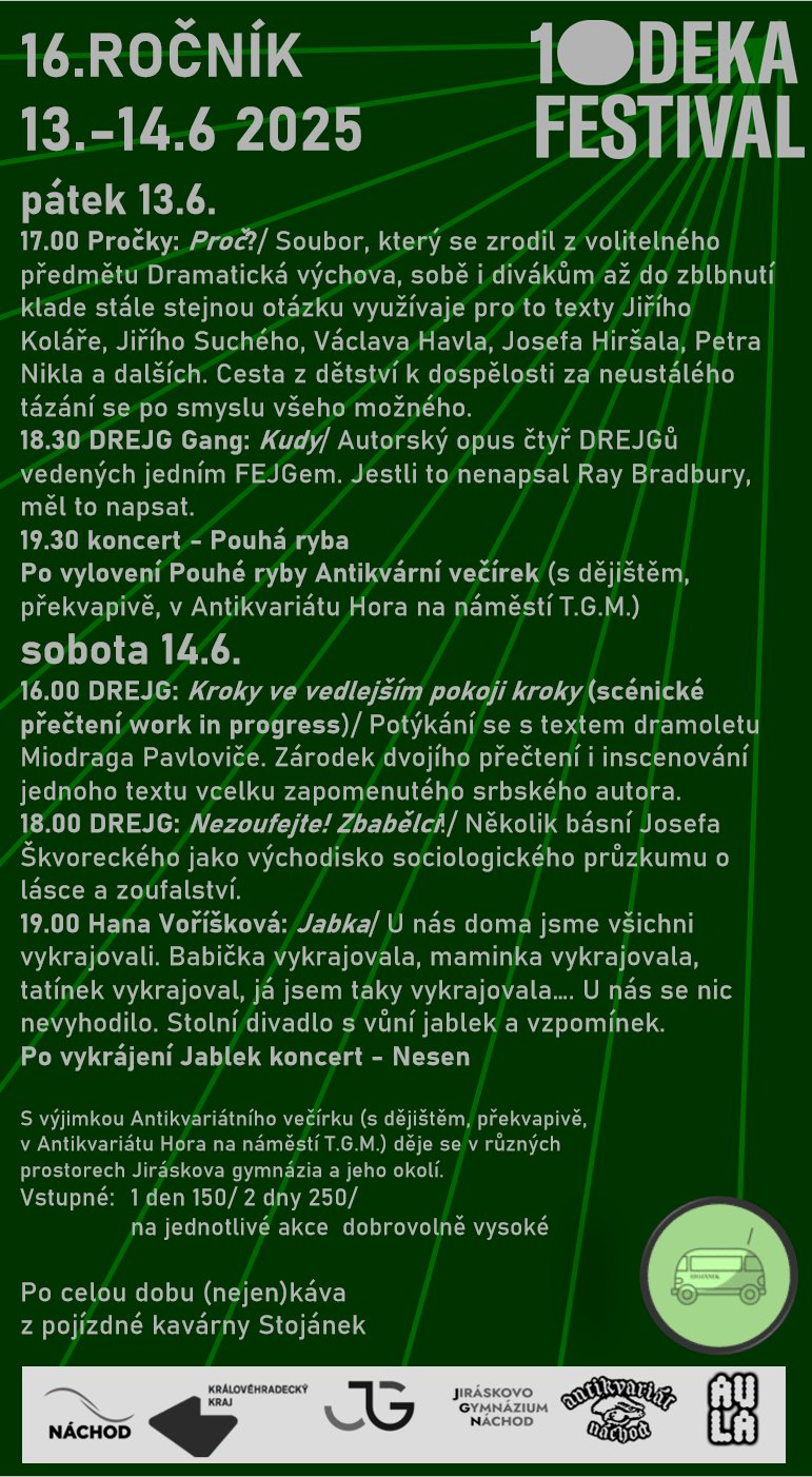 Deset Deka Festival 2025 Různá místa Náchod 13.06.2025 - 14.06.2025, Vstupné: 16. ročník přehlídky divadel spjatých a spřátelených se soubory DRED, DREJG a Jiráskovým gymnáziem Náchod. Podrobný program naleznete na přiloženém plakátu. Plakát Deset Deka Festival 2025