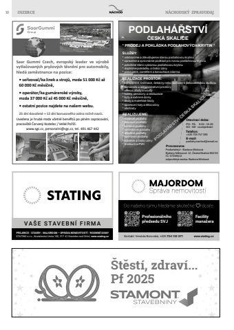 10 INZERCE N%u00c1CHODSK%u00dd ZPRAVODAJVA%u0160E STAVEBN%u00cd FIRMAPROJEKCE / STAVBY / MAJORDOM %u2013 SPR%u00c1VA NEMOVITOST%u00cd / RODINN%u00c9 DOMYSTATING s.r.o., Kosteleck%u00e1 Lhota 100, 517 41 Kostelec nad Orlic%u00ed, www.stating.czUvedena je hrub%u00e1 mzda v%u010detn%u011b benefit%u016f po pln%u00e9m zapracov%u00e1n%u00ed, pracovi%u0161t%u011b %u010cerven%u00fd Kostelec / Velk%u00e9 Po%u0159%u00ed%u010d%u00ed. www.sgc.cz, personalni@sgc.cz, tel. 491 467 442%u2022 oper%u00e1tor/ka gum%u00e1rensk%u00e9 v%u00fdroby, mzda 37 000 K%u010d a%u017e 45 000 K%u010d m%u011bs%u00ed%u010dn%u011b,%u2022 ostatn%u00ed pozice najdete na na%u0161em webu.Saar Gummi Czech, evropsk%u00fd leader ve v%u00fdrob%u011b vytla%u010dovan%u00fdch pry%u017eov%u00fdch t%u011bsn%u011bn%u00ed pro automobily, hled%u00e1 zam%u011bstnance na pozice:%u2022 se%u0159izova%u010d/ka linek a stroj%u016f, mzda 51 000 K%u010d a%u017e 60 000 K%u010d m%u011bs%u00ed%u010dn%u011b,25 dn%u00ed dovolen%u00e9 + 12 dn%u00ed bonusov%u00e9ho volna ro%u010dn%u011b nav%u00edc.PODLAH%u00c1%u0158STV%u00cd * PRODEJ A POKL%u00c1DKA PODLAHOV%u00ddCH KRYTIN *Otev%u00edrac%u00ed doba:SLU%u017dBY:REALIZACE PROSTOR:REALIZUJEME: * odstran%u00edme a zlikvidujeme starou podlahovou krytinu* oprav%u00edme a vyrovn%u00e1me podklad pro novou podlahovou krytinu * polo%u017e%u00edme V%u00e1mi vybranou podlahovou krytinu* dopln%u00edme pokl%u00e1dku o %u010dist%u00edc%u00ed z%u00f3ny* posouzen%u00ed, zam%u011b%u0159en%u00ed a konzultace zdarma * nemocnice, ordinace, %u010dek%u00e1rny nebo domovy s pe%u010dovatelskou slu%u017ebou * kancel%u00e1%u0159e a administrativn%u00ed prostory * obecn%u00ed %u00fa%u0159ady a soudy * hotely, penziony a restaurace * byty a rodinn%u00e9 domy * %u0161koly a mate%u0159sk%u00e9 %u0161koly * sportovn%u00ed haly a t%u011blocvi%u010dny * obchody * vynilov%u00e9 podlahy * plovouc%u00ed podlahy * korkov%u00e9 podlahy * lamin%u00e1tov%u00e9 podlahy* d%u0159ev%u011bn%u00e9 podlahy * sportovn%u00ed podlahy * koberce a %u010dist%u00edc%u00ed z%u00f3ny* linoleum a PVC PODLAH%u00c1%u0158STV%u00cd %u010cESK%u00c1 SKALICE Telefon:E-mail:+420 725 747 383 podlahy.nachod@email.czPO - P%u00c1 9:00 - 15:00 SO - NE na objedn%u00e1n%u00ed %u010cESK%u00c1 SKALICE Podlah%u00e1%u0159stv%u00ed - Barbora Wickov%u00e1 Bo%u017eeny N%u011bmcov%u00e9 12, %u010cesk%u00e1 Skalice 552 03I%u010c: 07246412 odpov%u011bdn%u00e1 osoba: Barbora Wickov%u00e1 Provozovna:N%u00e1chod 178x59 mm %u010cB 4B 2024 %u201ePf%u201c%u0160t%u011bst%u00ed, zdrav%u00ed...Pf 2025Kontakt: Vendula Borovsk%u00e1, +420 724 132 571 www.stating.czProfesion%u00e1ln%u00edhop%u0159edsedu SVJFacilitymana%u017eera