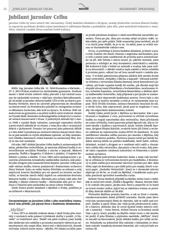 22 JUBILANT JAROSLAV CELBA N%u00c1CHODSK%u00dd ZPRAVODAJRNDr. Ing. Jaroslav Celba (26. 12. 1924 Kramolna u N%u00e1choda %u2013 27. 2. 2013 Praha) studoval na n%u00e1chodsk%u00e9m gymn%u00e1ziu. Studium musel v dob%u011b druh%u00e9 sv%u011btov%u00e9 v%u00e1lky p%u0159eru%u0161it a byl tot%u00e1ln%u011b nasazen do n%u00e1chodsk%u00e9 tov%u00e1rny s v%u00e1le%u010dnou v%u00fdrobou Mettalbauwerk. Ji%u017e od ml%u00e1d%u00ed se Jaroslav v%u011bnoval hudb%u011b. U%u010dil se h%u0159e na klav%u00edru profesorky St%u0159edov%u00e9, kter%u00e1 ho z%u00e1rove%u0148 p%u0159ipravovala ke zkou%u0161k%u00e1m na konzervato%u0159. Za Protektor%u00e1tu p%u016fsobil ve swingov%u00e9m orchestru Miloslava Zachovala, kde hr%u00e1l na kytaru. Po kv%u011btnu 1945 odmaturoval na gymn%u00e1ziu a na p%u0159%u00e1n%u00ed rodi%u010d%u016f za%u010dal studovat chemii na Vysok%u00e9 %u0161kole chemicko-technologick%u00e9ho in%u017een%u00fdrstv%u00ed a sou%u010dasn%u011b ve%u010dern%u00ed konzervato%u0159 v Praze. Z politick%u00fdch d%u016fvod%u016f byl v %u00fanoru 1948 z vysok%u00e9 %u0161koly vylou%u010den, nastoupil vojenskou slu%u017ebu a pot%u00e9 str%u00e1vil n%u011bkolik let ve v%u011bzen%u00ed, z toho dva roky v uranov%u00fdch dolech v J%u00e1chymov%u011b. Dvan%u00e1ct let pracoval jako pomocn%u00fd d%u011bln%u00edk a v t%u00e9to dob%u011b vystudoval po ve%u010derech lidovou konzervato%u0159. Dlouho se pak nemohl se sv%u00fdmi skladbami uplatnit, a%u017e d%u00edky anim%u00e1torovi Zde%u0148ku Smetanovi z%u00edskal kontakt na animovan%u00fd film, kter%u00fd se mu stal osudn%u00fdm. Od roku 1967 skl%u00e1dal Jaroslav Celba hudbu k animovan%u00fdm film%u016fm, p%u0159edev%u0161%u00edm ve%u010dern%u00ed%u010dk%u016fm. Je autorem obl%u00edben%u00e9 hudby k ve%u010dern%u00ed%u010dkov%u00fdm seri%u00e1l%u016fm Poh%u00e1dky z mechu a kaprad%u00ed, Makov%u00e1 panenka, %u0160tafl%u00edk a %u0160pagetka, O klukovi z plak%u00e1tu, O hajn%u00e9m Rob%u00e1tkovi a jelenu a dal%u0161%u00edm. V roce 1964 za%u010dal spolupracovat s jazzov%u00fdm orchestrem Arm%u00e1dn%u00edho um%u011bleck%u00e9ho souboru, kde p%u016fsobil jako dirigent jeho kamar%u00e1d Pavel Bayerle. Jaroslav Celba psal tak%u00e9 v%u00e1%u017enou hudbu, kterou poskytoval i Komorn%u00edmu orchestru Sl%u00e1vy Vorlov%u00e9. Suitu ze sv%u00e9ho baletu D%u011bv%u010d%u00e1tko se sirkami a sv%u016fj smy%u010dcov%u00fd kvartet Harlek%u00fdn pro n%u011b upravil na kvartet orchestr%u00e1ln%u00ed, se kter%u00fdm slavili velk%u00fd %u00fasp%u011bch na celost%u00e1tn%u00edm festivalu komorn%u00ed hudby v Olomouci. N%u00e1chodu jsou ur%u010deny tak%u00e9 jeho dv%u011b skladby z oblasti c%u00edrkevn%u00ed hudby %u2013 N%u00e1chodsk%u00e1 m%u0161e pro sv. Vav%u0159ince a V%u00e1no%u010dn%u00ed m%u0161e n%u00e1chodsk%u00e1 na slova Libora Voln%u00e9ho. Z%u00e1v%u011br %u017eivota pro%u017eil skladatel v My%u0161l%u00edn%u011b u Prahy, poh%u0159ben je na h%u0159bitov%u011b v Mnichovic%u00edch. Jubilant Jaroslav CelbaZavzpom%u00ednejme na Jaroslava Celbu s jeho man%u017eelkou Annou, kter%u00e1 v%u00e1m p%u0159ibl%u00ed%u017e%u00ed, jak plynul %u017eivot s hudebn%u00edm skladatelem.%u201eMy%u0161l%u00edn%u201cV roce 1973 se sh%u00e1n%u011bly rodinn%u00e9 domy v okol%u00ed Prahy p%u0159es inzer%u00e1ty v novin%u00e1ch nebo pomoc%u00ed v%u00fdv%u011bskov%u00e9 slu%u017eby v pas%u00e1%u017ei %u201eU Nov%u00e1k%u016f%u201c ve Vodi%u010dkov%u011b ulici. T%u00e9m%u011b%u0159 rok p%u0159ed svatbou jsem ka%u017ed%u00fd den sledovala tyto nab%u00eddky a po mnoha marn%u00fdch v%u00fdletech po nemovitostech n%u00e1s zaujal d%u016fm, kter%u00fd st%u00e1l v Mnichovic%u00edch, kousek od Prahy. Oslovil n%u00e1zev m%u00edsta %u2013 My%u0161l%u00edn. P%u0159i %u010dek%u00e1n%u00ed na kl%u00ed%u010de jsme se pro%u0161li p%u016fvabnou krajinou v okol%u00ed neuv%u011b%u0159iteln%u011b zarostl%u00e9ho pozemku. Tr%u00e1va po p%u00e1s, d%u016fm pro stromy nebyl od plotu vid%u011bt, nikde nikdo, jen zp%u011bv pt%u00e1k%u016f. Tolik romantiky jsme ne%u010dekali, ale ji%u017e v tu chv%u00edli jsme v%u011bd%u011bli, %u017ee je to on. Za m%u011bs%u00edc jsme se vr%u00e1tili rovnou ze Starom%u011bstsk%u00e9 radnice sem.Prvn%u00ed, co pot%u0159ebuje k %u017eivotu hudebn%u00ed skladatel, je klav%u00edr a psac%u00ed st%u016fl. Dodnes v%u0161e slou%u017e%u00ed. Pianino s anglickou mechanikou, psac%u00ed st%u016fl a postel jsme nast%u011bhovali do prvn%u00edho patra orientovan%u00e9ho na jih, kde nebyla o m%u00fazy nouze. J%u00e1, jako%u017eto neznal%u00e1, jsem pe%u010dovala o st%u0159%u00eddaj%u00edc%u00ed se %u010dety instalat%u00e9r%u016f, elektrik%u00e1%u0159%u016f a zedn%u00edk%u016f. M%u00e9 kr%u00e1lovstv%u00ed bylo v k%u016fln%u011b na zahrad%u011b u studny, kde jsem va%u0159ila na dvouva%u0159i%u010di, v d%u011btsk%u00e9 vani%u010dce myla n%u00e1dob%u00ed a ob%u010das vzhl%u00e9dla k prvn%u00edmu patru, odkud %u010das od %u010dasu zazn%u011bl motiv z na%u0161eho pianina. V t%u00e9 dob%u011b pokra%u010dovala p%u0159%u00edprava dal%u0161%u00edch d%u00edl%u016f seri%u00e1lu druh%u00e9 %u0159ady ve%u010dern%u00ed%u010dk%u016f %u201ePoh%u00e1dky z Mechu a kaprad%u00ed%u201c. Ob%u010dasn%u00e9 n%u00e1v%u0161t%u011bvy re%u017eis%u00e9ra a v%u00fdtvarn%u00edka Zdenka Smetany, kter%u00fd konzultoval s Jarykem, jak bude vypadat ka%u017ed%u00fd d%u00edl seri%u00e1lu, jak dlouh%u00e9 maj%u00ed b%u00fdt stop%u00e1%u017ee situac%u00ed mezi K%u0159em%u00edlkem a Vochom%u016frkou, neu%u010desanou v%u00edlou, tcho%u0159em %u0160uperkou, vever%u010d%u00e1kem Bezezubkou a dal%u0161%u00edmi akt%u00e9ry n%u00e1dhern%u00e9ho ve%u010dern%u00ed%u010dku, byly p%u0159%u00edjemn%u00e9 a pro Jaryka to znamenalo tyto akce doprovodit hudebn%u00edmi motivy. Proto bylo u n%u00e1s ticho, aby ty motivy neutekly a stihl je ve vymezen%u00e9m %u010dase napsat. T%u011bch 39 d%u00edl%u016f vznikalo, zat%u00edmco %u0159emesln%u00edci bouchali do zd%u00ed, a chv%u00edle ticha, kdy nepracovali, Jaryk psal se stopkami v ruce, aby v%u0161e odp