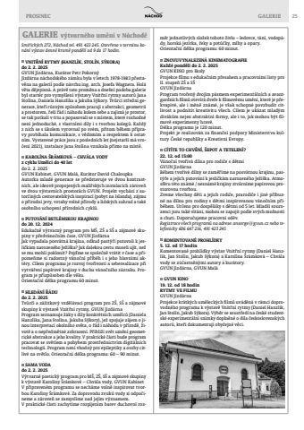 PROSINEC GALERIE 25GALERIE v%u00fdtvarn%u00e9ho um%u011bn%u00ed v N%u00e1chod%u011bSmi%u0159ick%u00fdch 272, N%u00e1chod tel. 491 423 245. Otev%u0159eno v term%u00ednu kon%u00e1n%u00ed v%u00fdstav denn%u011b krom%u011b pond%u011bl%u00ed od 9 do 17 hodin. VNIT%u0158N%u00cd RYTMY (HANZL%u00cdK, STOL%u00cdN, S%u00ddKORA)do 2. 2. 2025GVUN J%u00edzd%u00e1rna, Kur%u00e1tor Petr Pokorn%u00fdJ%u00edzd%u00e1rna n%u00e1chodsk%u00e9ho z%u00e1mku byla v letech 1978-1983 p%u0159estav%u011bna na galerii podle n%u00e1vrhu ing. arch. Josefa Wagnera. Hol%u00e1 v%u011bta d%u011bjepisn%u00e1. A pr%u00e1v%u011b tato prom%u011bna a dne%u0161n%u00ed podoba galerie byl start%u00e9r pro vymy%u0161len%u00ed v%u00fdstavy Vnit%u0159n%u00ed rytmy autor%u016f Jana Stol%u00edna, Daniela Hanzl%u00edka a Jakuba S%u00fdkory. Tv%u016frci st%u0159edn%u00ed generace, kte%u0159%u00ed r%u016fzn%u00fdm zp%u016fsobem pracuj%u00ed s abstrakc%u00ed, geometri%u00ed a prostorem, %u0159e%u0161%u00ed %u0159%u00e1d i n%u00e1hodu kolem sebe a zaj%u00edm%u00e1 je prostor, se tak potkali v triu a popasovali se s m%u00edstem, kter%u00e9 rozhodn%u011b nen%u00ed jednoduch%u00e9, s vlastn%u00edmi d%u00edly i s tvorbou koleg%u016f. Ka%u017ed%u00fd z nich se s %u00fakolem vyrovnal po sv%u00e9m, p%u0159itom b%u011bhem p%u0159%u00edpravy prob%u00edhala komunikace, s v%u011bdom%u00edm a respektem k ostatn%u00edm. Vystaven%u00e9 pr%u00e1ce jsou z posledn%u00edch let (nejstar%u0161%u00ed m%u00e1 vro%u010den%u00ed 2021), instalace Jana Stol%u00edna vznikala p%u0159%u00edmo na m%u00edst%u011b. KAROL%u00cdNA %u0160R%u00c1MKOV%u00c1 %u2013 CHV%u00c1LA VODYz cyklu Um%u011blci do 40 letdo 2. 2. 2025GVUN Kabinet, GVUN Mal%u00e1, Kur%u00e1tor David ChaloupkaAutorka mlad%u00e9 generace se p%u0159edstavuje ve dvou kontrastn%u00edch, ale ideov%u011b propojen%u00fdch mal%u00ed%u0159sk%u00fdch instalac%u00edch z%u00e1rove%u0148 ve dvou v%u00fdstavn%u00edch prostor%u00e1ch GVUN. Projekt vych%u00e1z%u00ed z autor%u010din%u00fdch cestovatelsk%u00fdch inspirac%u00ed (pobyt na Islandu), z%u00e1jmu o p%u0159%u00edrodn%u00ed jevy, vztahy voln%u00e9 p%u0159%u00edrody a lidsk%u00fdch zahrad a tak%u00e9 osobn%u00edho uchopen%u00ed p%u0159%u00edrodn%u00edch cykl%u016f. PUTOV%u00c1N%u00cd BETL%u00c9MSKOU KRAJINOUdo 20. 12. 2024Eduka%u010dn%u011b v%u00fdtvarn%u00fd program pro M%u0160, Z%u0160 a S%u0160 a z%u00e1jmov%u00e9 skupiny v p%u0159edv%u00e1no%u010dn%u00edm %u010dase, GVUN J%u00edzd%u00e1rnaJak vypadala posv%u00e1tn%u00e1 krajina, odkud past%u00fd%u0159i putovali k jesli%u010dk%u00e1m narozen%u00e9ho Je%u017e%u00ed%u0161ka? Jak dalekou cestu museli uj%u00edt, ne%u017e se mu mohli poklonit? Poj%u010fme se spole%u010dn%u011b vr%u00e1tit v %u010dase a p%u0159ipome%u0148me si radostn%u00fd v%u00e1no%u010dn%u00ed p%u0159%u00edb%u011bh i s jeho hlavn%u00edmi akt%u00e9ry. C%u00edlem programu je rozvoj tvo%u0159ivosti a seberealizace p%u0159i vytv%u00e1%u0159en%u00ed pap%u00edrov%u00e9 krajiny v duchu v%u00e1no%u010dn%u00edho z%u00e1zraku. Program je p%u0159izp%u016fsoben dle v%u011bku. Orienta%u010dn%u00ed d%u00e9lka programu 60 minut. HLED%u00c1N%u00cd %u0158%u00c1DU do 2. 2. 2025Tv%u016fr%u010d%u00ed a z%u00e1%u017eitkov%u00fd vzd%u011bl%u00e1vac%u00ed program pro Z%u0160, S%u0160 a z%u00e1jmov%u00e9 skupiny k v%u00fdstav%u011b Vnit%u0159n%u00ed rytmy, GVUN J%u00edzd%u00e1rnaProgram seznamuje %u017e%u00e1ky s d%u00edly konkr%u00e9tn%u00edch um%u011blc%u016f (Daniela Hanzl%u00edka, Jana Stol%u00edna, Jakuba S%u00fdkory), je%u017e spojuje z%u00e1jem o jinou interpretaci okoln%u00edho sv%u011bta, o %u0159%u00e1d i n%u00e1hodu v p%u0159%u00edrod%u011b, %u017eivot%u011b a o nep%u0159edm%u011btn%u00e9 zobrazen%u00ed. P%u0159ibl%u00ed%u017e%u00ed sv%u011bt um%u011bn%u00ed geometrick%u00e9 abstrakce a jeho kvality. V praktick%u00e9 %u010d%u00e1sti bude program pracovat se sv%u011btlem a pohybem prost%u0159ednictv%u00edm digit%u00e1ln%u00edch technologi%u00ed. Program nen%u00ed vhodn%u00fd pro epileptiky a osoby citliv%u00e9 na sv%u011btlo. Orienta%u010dn%u00ed d%u00e9lka programu: 60 %u2013 90 minut. SAMA VODAdo 2. 2. 2025V%u00fdtvarn%u011b poetick%u00fd program pro M%u0160, Z%u0160, S%u0160 a z%u00e1jmov%u00e9 skupiny k v%u00fdstav%u011b Karol%u00edny %u0160r%u00e1mkov%u00e9 %u2013 Chv%u00e1la vody, GVUN KabinetV p%u0159ipraven%u00e9m programu se nech%u00e1me voln%u011b inspirovat tvorbou Karol%u00edny %u0160r%u00e1mkov%u00e9. Za doprovodu zvuk%u016f vody si odpo%u010dineme a z%u00e1rove%u0148 se zamysl%u00edme nad jej%u00edm v%u00fdznamem. V praktick%u00e9 %u010d%u00e1sti zachyt%u00edme rozp%u00edjen%u00edm barev duchovn%u00ed rozm%u011br jednotliv%u00fdch slo%u017eek tohoto %u017eivlu %u2013 ledovce, t%u00e1n%u00ed, vodop%u00e1dy, horsk%u00e1 jez%u00edrka, %u0159eky a pot%u016f%u010dky, mlhy a opary. Orienta%u010dn%u00ed d%u00e9lka programu: 60 minut. ZNOVUVYNALEZEN%u00c1 KINEMATOGRAFIE Ka%u017ed%u00e9 pond%u011bl%u00ed do 2. 2. 2025GVUN KINO pro %u0161kolyProjekce filmu s eduka%u010dn%u00edm p%u0159esahem a pracovn%u00edmi listy pro II. stupe%u0148 Z%u0160 a S%u0160GVUN J%u00edzd%u00e1rnaProgram tvo%u0159en%u00fd dvoj%u00edm p%u00e1smem experiment%u00e1ln%u00edch a avantgardn%u00edch film%u016f otev%u00edr%u00e1 dve%u0159e k filmov%u00e9mu um%u011bn%u00ed, kter%u00e9 je p%u0159ekvapiv%u00e9, ale i m%u00e9n%u011b zn%u00e1m%u00e9, je v%u0161ak schopn%u00e9 povzbudit citlivost a podn%u00edtit kreativitu v%u0161ech. C%u00edlem je uk%u00e1zat mlad%u00fdm div%u00e1k%u016fm nejen abstraktn%u00ed formy, ale i to, jak mohou b%u00fdt filmov%u00e9 experimenty hrav%u00e9. D%u00e9lka programu je 120 minut.Projekt je realizov%u00e1n za finan%u010dn%u00ed podpory Ministerstva kultury %u010cesk%u00e9 republiky a Kreativn%u00ed Evropy. C%u00cdT%u00cdTE TO CHV%u011aN%u00cd, %u0160EPOT A TETELEN%u00cd? 22. 12. od 15:00V%u00e1no%u010dn%u00ed tvo%u0159iv%u00e1 d%u00edlna pro rodi%u010de s d%u011btmi GVUN J%u00edzd%u00e1rnaB%u011bhem tvo%u0159iv%u00e9 d%u00edlny se zam%u011b%u0159%u00edme na pos