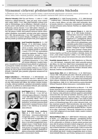 26 V%u00ddZNAMN%u00c9 N%u00c1CHODSK%u00c9 OSOBNOSTI N%u00c1CHODSK%u00dd%u2009 ZPRAVODAJV%u00fdznamn%u00ed c%u00edrkevn%u00ed p%u0159edstavitel%u00e9 m%u011bsta N%u00e1chodaU p%u0159%u00edle%u017eitosti oslav 770. v%u00fdro%u010d%u00ed prvn%u00ed p%u00edsemn%u00e9 zm%u00ednky o m%u011bst%u011b N%u00e1chod%u011b p%u0159ipomeneme v%u00fdznamn%u00e9 c%u00edrkevn%u00ed p%u0159edstavitele %u2013 duchovn%u00ed, kn%u011bze, kte%u0159%u00ed z N%u00e1choda poch%u00e1zeli, nebo zde p%u016fsobili v duchovn%u00ed sf%u00e9%u0159e. (105 let od narozen%u00ed).Viktorin Vrbensk%u00fd (1580 T%u00fdn nad Vltavou %u2013 2. nebo 4. 3. 1622 Dobrovice u Mlad%u00e9 Boleslavi) %u2013 kn%u011bz pod oboj%u00ed, mistr svobodn%u00fdch um%u011bn%u00ed (1603). V roce 1606 p%u0159ijal kn%u011b%u017eskou ordinaci (sv%u011bcen%u00ed) ve W%u00fcttembergu, stal se d%u011bkanem v N%u00e1chod%u011b a o%u017eenil se. Na jeho po%u010dest vydali p%u0159%u00e1tel%u00e9, mezi nimi%u017e byl i Mistr Kampanus Vod%u0148ansk%u00fd, oslavn%u00fd sborn%u00edk. V roce 1609 ode%u0161el z N%u00e1choda, za%u010dal p%u016fsobit v Praze jako duchovn%u00ed a p%u0159%u00edsed%u00edc%u00ed konzisto%u0159e podoboj%u00ed. Byl jedn%u00edm z kn%u011b%u017e%u00ed, kte%u0159%u00ed poskytli duchovn%u00ed %u00fat%u011bchu odsouzen%u00fdm p%u0159ed%u00e1k%u016fm stavovsk%u00e9ho povst%u00e1n%u00ed p%u0159ed jejich popravou 20. 6. 1621. Byl perzekvov%u00e1n, v roce 1921 vypov%u011bzen z %u010desk%u00fdch zem%u00ed a ukr%u00fdval se na panstv%u00ed Henyka z Vald%u0161tejna na Dobrovici, kde brzy zem%u0159el. Je autorem spisu Konfes%u00ed %u010desk%u00e1, prav%u00e1 aug%u0161pursk%u00e1.Josef Franti%u0161ek Hurd%u00e1lek (6. 11. 1747 N%u00e1chod %u2013 27. 12. 1833 Praha) %u2013 duchovn%u00ed, n%u00e1rodn%u00ed buditel. V roce 1771 byl vysv%u011bcen na kn%u011bze, svoji prvn%u00ed m%u0161i slou%u017eil v n%u00e1chodsk%u00e9m kostele sv. Michaela, v letech 1773%u20131775 byl n%u00e1chodsk%u00fdm z%u00e1meck%u00fdm kaplanem. Vzd%u011blan%u00fd osv%u00edcensk%u00fd duchovn%u00ed stoupal v c%u00edrkevn%u00edch hodnostech, byl jmenov%u00e1n rektorem gener%u00e1ln%u00edho semin%u00e1%u0159e pro %u010cechy v pra%u017esk%u00e9m Klementinu. V roce 1794 byl ustaven d%u011bkanem a posl%u00e9ze biskupem v Litom%u011b%u0159ic%u00edch. Byl liter%u00e1rn%u011b %u010dinn%u00fd, p%u0159%u00e1telil se s p%u0159edstaviteli po%u010d%u00ednaj%u00edc%u00edho %u010desk%u00e9ho n%u00e1rodn%u00edho %u017eivota. V roce 1890 byly jeho ostatky exhumov%u00e1ny z malostransk%u00e9ho h%u0159bitova a ve schr%u00e1nce ulo%u017eeny do zdi po prav%u00e9 stran%u011b hlavn%u00edho olt%u00e1%u0159e kostela sv. Jana K%u0159titele v N%u00e1chod%u011b. Jeho pam%u00e1tku p%u0159ipom%u00edn%u00e1 mramorov%u00e1 n%u00e1hrobn%u00ed deska.Ka%u0161par Lukavsk%u00fd (6. 1. 1783 N%u00e1chod %u2013 1. 5. 1845 N%u00e1chod) %u2013 narodil se v rodin%u011b u%u010ditele a varhan%u00edka. Dne 24. 8. 1804 byl vysv%u011bcen na kn%u011bze a ustaven kaplanem na n%u00e1chodsk%u00e9m d%u011bkanstv%u00ed, kde od roku 1829 p%u016fsobil jako d%u011bkan. Byl velk%u00fdm ctitelem chr%u00e1mov%u00e9 hudby, v%u00fdborn%u00fd hudebn%u00edk, zakladatel n%u00e1chodsk%u00e9ho hudebn%u00edho gr%u00e9mia. Je poh%u0159ben na n%u00e1chodsk%u00e9m h%u0159bitov%u011b, jeho n%u00e1hrobn%u00ed deska ve zdi kostela byla ned%u00e1vno opravena.Josef Regner (24. 2. 1794 Havlovice %u2013 11. 5. 1852 N%u00e1chod) %u2013 v roce 1817 p%u016fsobil jako kaplan d%u011bkanstv%u00ed v N%u00e1chod%u011b, v roce 1829 z%u00e1meck%u00fd kaplan a od roku 1845 n%u00e1chodsk%u00fd d%u011bkan. Pat%u0159%u00ed k v%u00fdznamn%u00fdm p%u0159edstavitel%u016fm n%u00e1rodn%u00edho buditelstv%u00ed, je %u00fast%u0159edn%u00ed postavou (far%u00e1%u0159 Havlovick%u00fd) v rom%u00e1nov%u00e9 kronice Aloise Jir%u00e1ska U n%u00e1s. Poh%u0159ben je na n%u00e1chodsk%u00e9m h%u0159bitov%u011b.Karel Bohuslav L%u00e1ny, profesor, ThDr. (6. 3. 1870 %u010cernilov %u2013 22. 8. 1949 Praha) %u2013 v%u00fdznamn%u00fd p%u0159edstavitel evangelick%u00e9 c%u00edrkve, v roce 1893 vik%u00e1%u0159 a v roce 1895 far%u00e1%u0159 evangelick%u00e9ho sboru v %u0160onov%u011b. Zaslou%u017eil se o roz%u0161%u00ed%u0159en%u00ed sboru a vytvo%u0159en%u00ed evangelick%u00fdch kazatelsk%u00fdch stanic v %u010cesk%u00e9 Skalici, Nov%u00e9m M%u011bst%u011b nad Metuj%u00ed a v N%u00e1chod%u011b. Od roku 1930 p%u016fsobil na evangelick%u00e9 teologick%u00e9 vysok%u00e9 %u0161kole v Bratislav%u011b, p%u0159edn%u00e1%u0161el zejm%u00e9na na historick%u00e1, n%u00e1bo%u017eensk%u00e1 t%u00e9mata. Autor %u0159ady n%u00e1bo%u017eensk%u00fdch a historick%u00fdch %u010dl%u00e1nk%u016f.Josef Mach (17. 2. 1820 %u010cerven%u00fd Kostelec %u2013 17. 5. 1884 N%u00e1chod) %u2013 vzd%u011blan%u00fd kn%u011bz, v N%u00e1chod%u011b obl%u00edben%u00fd. Biskupsk%u00fd konsistori%u00e1ln%u00ed rada a not%u00e1%u0159, d%u011bkan a od roku 1864 vik%u00e1%u0159 n%u00e1chodsk%u00fd. Nositel mnoha st%u00e1tn%u00edch a c%u00edrkevn%u00edch vyznamen%u00e1n%u00ed. Byl jmenov%u00e1n %u010destn%u00fdm ob%u010danem m%u011bsta N%u00e1chod. Poh%u0159ben na zdej%u0161%u00edm h%u0159bitov%u011b u kostela. Josef Anton%u00edn %u0160r%u016ftek (2. 9. 1822 N%u00e1chod %u2013 21. 6. 1901 Hradec Kr%u00e1lov%u00e9) %u2013 vzd%u011blan%u00fd kn%u011bz, kanovn%u00edk v Hradci Kr%u00e1lov%u00e9 (1876), pape%u017esk%u00fd prel%u00e1t (1896). Anga%u017eoval se v pedagogick%u00e9 oblasti, vyd%u00e1val pedagogick%u00fd %u010dasopis %u0160koln%u00edk, v roce 1859 se stal zakladatelem vydavatelsk%u00e9ho spolku D%u011bdictv%u00ed mali%u010dk%u00fdch, orientovan%u00e9ho na v%u00fdchovn%u00e9 kn%u00ed%u017eky pro ml%u00e1de%u017e. Redigoval %u010dasopis Polabsk%u00fd Slovan, kter%u00fd vych%u00e1zel v Hradci Kr%u00e1lov%u00e9. Jeho liter%u00e1rn%u00ed tvorba je obs%u00e1hl%u00e1, mj. bro%u017eura Kapli%u010dka nad Plhovem na Hrobku u N%u00e1choda, kterou v%u011bnoval %u201esv%u00fdm mil%u00fdm krajan%u016fm%u201c (1862). V roce 1855 byl jmenov%u00e1