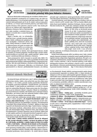 DUBEN MUZEUM, Z%u00c1MEK 25Um%u00edr%u00e1%u010dek pobo%u017en%u00fd Mila Jana Hubatia z KotnovaZ MUZEJN%u00cdHO DEPOZIT%u00c1%u0158EMuzeum N%u00e1chodska nedisponuje jen rozs%u00e1hlou sb%u00edrkou historick%u00fdch p%u0159edm%u011bt%u016f vztahuj%u00edc%u00edch se k na%u0161emu kraji, ale tak%u00e9 rozs%u00e1hlou knihovnou. V n%u00ed se nach%u00e1z%u00ed tak%u00e9 %u0159ada star%u00fdch tisk%u016f %u2013 tedy ru%u010dn%u00edch tisk%u016f po%u0159%u00edzen%u00fdch od 15. do 19. stolet%u00ed. Letos je tomu p%u0159esn%u011b 300 let, co v Praze vy%u0161el Um%u00edr%u00e1%u010dek pobo%u017en%u00fd, aneb %u017e%u00e1dost bohabojn%u00e9ho k%u0159es%u0165ana cht%u00edti pobo%u017en%u011b a %u0161%u0165astn%u011b um%u0159%u00edti. Tuto knihu p%u0159%u00edprav na tzv. dobrou smrt sepsal Milo Jan Hubatius z Kotnova. Ne%u017e se v%u0161ak dostaneme k jeho osud%u016fm a zm%u00edn%u011bn%u00e9 knize, pov%u011bzme si stru%u010dn%u011b n%u011bco o onom fenom%u00e9nu dobr%u00e9 smrti.Nejen v baroku, ale i ve st%u0159edov%u011bku, mohl b%u00fdt %u017eivot v pravd%u011b slzav%u00fdm %u00fadol%u00edm. Lid%u00e9 si dob%u0159e uv%u011bdomovali pom%u00edjivost %u017eivota vezdej%u0161%u00edho i bla%u017eenost %u017eivota v%u011b%u010dn%u00e9ho. Dobr%u00fd k%u0159es%u0165an se nem%u011bl smrti b%u00e1t a nelitovat konce sv%u00e9 pouti na tomto sv%u011bt%u011b. Bylo nezbytn%u00e9 sm%u00ed%u0159it se se sv%u00fdm osudem a vydat se na cestu ke sp%u00e1se. Nutn%u00e9 bylo nedopou%u0161t%u011bt se h%u0159%u00edch%u016f, t%u011bch sp%u00e1chan%u00fdch litovat, chodit ke zpov%u011bdi a k svat%u00e9mu p%u0159ij%u00edm%u00e1n%u00ed. Poradcem byly v t%u011bchto z%u00e1le%u017eitostech kn%u00ed%u017eky ars moriendi, tedy %u201eum%u011bn%u00ed um%u00edr%u00e1n%u00ed%u201c. Jednu z nich sepsal i zmi%u0148ovan%u00fd Milo Jan Hubatius z Kotnova. Tento premonstr%u00e1t, far%u00e1%u0159 a kazatel se narodil roku 1660 v T%u00e1bo%u0159e. Zem%u0159el 20. listopadu roku 1726 na pra%u017esk%u00e9m Strahov%u011b, kde maj%u00ed premonstr%u00e1ti dodnes sv%u011btozn%u00e1m%u00fd kl%u00e1%u0161ter s impozantn%u00ed knihovnou. Ne%u017e zde na%u0161el Hubatius z Kotnova v%u011b%u010dn%u00fd odpo%u010dinek, p%u016fsobil mimo jin%u00e9 v Doksanech, Milevsku a ve Svin%u010danech. Krom spisovatelstv%u00ed se v%u011bnoval i p%u0159ekladatelsk%u00e9 %u010dinnosti a do %u010de%u0161tiny p%u0159evedl nap%u0159. meditativn%u00ed spisek gener%u00e1ln%u00edho vik%u00e1%u0159e premonstr%u00e1t%u016f Hieronyma Hirnheima z Elsenbergu Kv%u00edt%u00ed hory sionsk%u00e9.Um%u00edr%u00e1%u010dek pobo%u017en%u00fd, aneb %u017e%u00e1dost bohabojn%u00e9ho k%u0159es%u0165ana cht%u00edti pobo%u017en%u011b a %u0161%u0165astn%u011b um%u0159%u00edti vytiskl roku 1725 na Star%u00e9m M%u011bst%u011b pra%u017esk%u00e9m Karel Josef Je%u0159%u00e1bek. Datab%u00e1ze Knihopis, kterou spravuje N%u00e1rodn%u00ed knihovna %u010cR, uv%u00e1d%u00ed %u0161est zn%u00e1m%u00fdch v%u00fdtisk%u016f t%u00e9to knihy. N%u00e1chodsk%u00fd exempl%u00e1%u0159 bohu%u017eel nen%u00ed kompletn%u00ed. Ze 452 stran se dochovali pouze strany 35 a%u017e 440. V jednotliv%u00fdch kapitol%u00e1ch se sna%u017e%u00ed autor podat srozumiteln%u00fd v%u00fdklad z%u00e1sadn%u00edch ot%u00e1zek spojen%u00fdch se smrt%u00ed a barokn%u00ed zbo%u017enost%u00ed. P%u0159ipravuje nemocn%u00e9ho na poklidn%u00e9 um%u00edr%u00e1n%u00ed, prozrazuje, kam po smrti p%u0159ijdou du%u0161e nek%u0159t%u011b%u0148%u00e1tek, p%u0159ikl%u00e1d%u00e1 i p%u0159%u00edb%u011bhy t%u011bch, kte%u0159%u00ed %u017eili ctnostn%u00fdm %u017eivotem i t%u011bch, kte%u0159%u00ed na%u0161li cestu k Bohu v posledn%u00edch dnech p%u0159ed smrt%u00ed. Popisuje ov%u0161em i pekeln%u00e9 hr%u016fzy, kter%u00e9 %u010dekaj%u00ed h%u0159%u00ed%u0161n%u00edky (nap%u0159. muka %u010duchu v nosu ukrutn%u00e1). Varuje i p%u0159ed t%u00edm, %u017ee h%u0159%u00ed%u0161n%u00fdm k%u0159es%u0165an%u016fm se m%u016f%u017ee v pekle da%u0159it h%u016f%u0159 ne%u017e pohan%u016fm.Knihy, kter%u00e9 p%u0159ipravovaly v%u011b%u0159%u00edc%u00ed na dobrou smrt, byly v jist%u00e9m smyslu masovou produkc%u00ed a jednotliv%u00ed auto%u0159i nem%u011bli pot%u0159ebu teologick%u00e9 ot%u00e1zky zodpov%u00eddat origin%u00e1ln%u00edm zp%u016fsobem. %u0160lo sp%u00ed%u0161 o srozumiteln%u00e9 p%u0159etlumo%u010den%u00ed z%u00e1sadn%u00edch k%u0159es%u0165ansk%u00fdch hodnot a postoj%u016f v ot%u00e1zce um%u00edr%u00e1n%u00ed. I tak je Um%u00edr%u00e1%u010dek pobo%u017en%u00fd, aneb %u017e%u00e1dost bohabojn%u00e9ho k%u0159es%u0165ana cht%u00edti pobo%u017en%u011b a %u0161%u0165astn%u011b um%u0159%u00edti z pera Mila Jana Hubatia z Kotnova pozoruhodn%u00fdm historick%u00fdm pramenem k pozn%u00e1n%u00ed barokn%u00ed zbo%u017enosti. Mgr. P. %u0160m%u00edd, Muzeum N%u00e1chodskaNa z%u00e1meck%u00fd kopec p%u0159ich%u00e1z%u00ed jaro a my 5. dubna zahajujeme n%u00e1v%u0161t%u011bvnickou sez%u00f3nu, tak%u017ee u n%u00e1s za%u010d%u00edn%u00e1 b%u00fdt zase %u017eivo. Bylo tomu tak t%u0159eba i v 19. stolet%u00ed, proto%u017ee matka posledn%u00edho %u0161lechtick%u00e9ho majitele, princezna Bathildis z Anhalt-Dessau, pr%u00fd milovala jarn%u00ed obdob%u00ed. V zim%u011b jezdila po n%u00e1v%u0161t%u011bv%u00e1ch a na ja%u0159e se vracela zp%u011bt do rozkvetl%u00e9ho N%u00e1choda. Nejen proto jsme pro V%u00e1s p%u0159ipravili na prvn%u00ed dubnov%u00fd v%u00edkend v expozici Z%u00e1mek za Schaumburg%u016f jarn%u00ed kv%u011btinovou v%u00fdzdobu, kde budete moct na%u010derpat kr%u00e1snou atmosf%u00e9ru, pro kterou tak%u00e9 tato n%u011bmeck%u00e1 kn%u00ed%u017eec%u00ed rodina pob%u00fdvala do %u010dervna na zdej%u0161%u00edm historick%u00e9m s%u00eddle.Jak u%u017e tak%u00e9 bylo zmi%u0148ov%u00e1no minul%u00fd m%u011bs%u00edc, leto%u0161n%u00ed sez%u00f3na se ponese v duchu projektu %u201ePo stop%u00e1ch %u0161lechtick%u00fdch rod%u016f%u201c s t%u00e9matem %u201eRok italsk%u00e9 %u0161lechty%u201c. A my s n%u00edm za%u010d%u00edn%u00e1me u%u017e te%u010f v dubnu. P%u0159