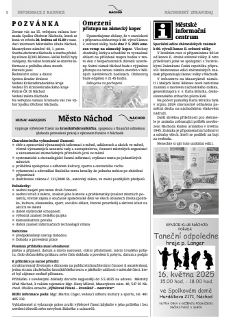 8 INFORMACE Z RADNICE N%u00c1CHODSK%u00dd ZPRAVODAJM%u011bstsk%u00e9informa%u010dn%u00edcentrumSpeci%u00e1ln%u00ed edice sb%u011bratelsk%u00fdch zn%u00e1mek k 80. v%u00fdro%u010d%u00ed konce II. sv%u011btov%u00e9 v%u00e1lky V leto%u0161n%u00edm roce si p%u0159ipom%u00edn%u00e1me 80 let od konce II. druh%u00e9 sv%u011btov%u00e9 v%u00e1lky. K t%u00e9to p%u0159%u00edle%u017eitosti jsme ve spolupr%u00e1ci s Turistick%u00fdmi Zn%u00e1mkami %u010cesk%u00e1 republika p%u0159ipravili limitovanou edici sb%u011bratelsk%u00fdch zn%u00e1mek p%u0159ipom%u00ednaj%u00edc%u00ed konec v%u00e1lky v N%u00e1chod%u011b. V infocentru na Masarykov%u011b n%u00e1m%u011bst%u00ed i Mal%u00fdch l%u00e1zn%u00ed B%u011bloves nov%u011b nab%u00edz%u00edme zn%u00e1mku s motivem n%u00e1chodsk%u00e9ho rod%u00e1ka, gener%u00e1lmajora v. v. Karla Mr%u00e1zka, %u010deskoslovensk%u00e9ho st%u00edhac%u00edho pilota RAF. Na po%u010dest pam%u00e1tky Karla Mr%u00e1zka byla v srpnu 2024 slavnostn%u011b odhalena pam%u011btn%u00ed deska na n%u00e1chodsk%u00e9m vlakov%u00e9m n%u00e1dra%u017e%u00ed. Dal%u0161%u00ed skv%u011blou p%u0159%u00edle%u017eitost%u00ed pro sb%u011bratele je zn%u00e1mka zobrazuj%u00edc%u00ed pr%u016fb%u011bh osvobozen%u00ed N%u00e1choda Rudou arm%u00e1dou v kv%u011btnu 1945. Zn%u00e1mka je p%u0159ipomenut%u00edm hrdinstv%u00ed a odvahy v%u0161ech, kte%u0159%u00ed se pod%u00edleli na boji za svobodu. Nenechte si uj%u00edt tuto unik%u00e1tn%u00ed edici.Upozor%u0148ujeme ob%u010dany, %u017ee v souvislosti s p%u0159%u00edpravou oh%u0148ostroje k 80. v%u00fdro%u010d%u00ed konce 2. sv%u011btov%u00e9 v%u00e1lky, bude dne 7. 5. 2025 omezen vstup na z%u00e1meck%u00fd kopec. V%u0161echny chodn%u00edky, l%u00e1vky a schodi%u0161t%u011b ve vyzna%u010den%u00e9 oblasti na p%u0159ilo%u017een%u00e9 mapce budou v tento den z bezpe%u010dnostn%u00edch d%u016fvod%u016f uzav%u0159eny. St%u00e1tn%u00ed z%u00e1mek N%u00e1chod bude s v%u00fdjimkou p%u0159%u00edstupu na terasu z%u00e1mku otev%u0159en v b%u011b%u017en%u00fdch n%u00e1v%u0161t%u011bvn%u00edch hodin%u00e1ch. Oh%u0148ostroj bude odp%u00e1len v 21.45 hodin.D%u011bkujeme za pochopen%u00ed.Zveme v%u00e1s na 15. ve%u0159ejnou valnou hromadu Spolku Obchvat N%u00e1choda, kter%u00e1 se kon%u00e1 ve st%u0159edu 28. kv%u011btna od 15.00 v zasedac%u00ed m%u00edstnosti M%u011bstsk%u00e9ho %u00fa%u0159adu N%u00e1chod, Masarykovo n%u00e1m%u011bst%u00ed 40, 1. patro.Stavba obchvatu N%u00e1choda a stavba p%u0159elo%u017eky silnice II/303 B%u011bloves%u2013Velk%u00e9 Po%u0159%u00ed%u010d%u00ed byly zah%u00e1jeny. Na valn%u00e9 hromad%u011b se dozv%u00edte informace o pr%u016fb%u011bhu obou staveb. Pozv%u00e1ni jsou: %u0158editelstv%u00ed silnic a d%u00e1lnic Spr%u00e1va Hradec Kr%u00e1lov%u00e9Veden%u00ed Kr%u00e1lov%u00e9hradeck%u00e9ho krajeVeden%u00ed %u00daS Kr%u00e1lov%u00e9hradeck%u00e9ho krajePolicie %u010cR DI N%u00e1chodVeden%u00ed m%u011bsta N%u00e1chodaNa ve%u0159ejnou valnou hromadu v%u00e1s zve v%u00fdbor Spolku Obchvat N%u00e1choda.P O Z V %u00c1 N K A Omezen%u00ed p%u0159%u00edstupu na z%u00e1meck%u00fd kopecMUNAC 46651/2025 M%u011bsto N%u00e1chodvypisuje v%u00fdb%u011brov%u00e9 %u0159%u00edzen%u00ed na kronik%u00e1%u0159e/kronik%u00e1%u0159ku, spojenou s fi nan%u010dn%u00ed odm%u011bnou (dohoda proveden%u00ed pr%u00e1ce) s v%u00fdkonem funkce v N%u00e1chod%u011bCharakteristika vykon%u00e1van%u00e9 %u010dinnosti: sb%u011br a zpracov%u00e1n%u00ed v%u00fdznamn%u00fdch informac%u00ed o m%u011bst%u011b, ud%u00e1lostech a akc%u00edch ve m%u011bst%u011b, v%u010detn%u011b v%u00fdznamn%u00fdch usnesen%u00ed rady a zastupitelstva, %u010dinnosti m%u011bstsk%u00fdch organizac%u00ed a zaznamen%u00e1n%u00ed mimo%u0159%u00e1dn%u00fdch p%u0159%u00edrodn%u00edch jev%u016f ve m%u011bst%u011b systematick%u00e9 a chronologick%u00e9 %u0159azen%u00ed informac%u00ed, stylizace textu po jednotliv%u00fdch m%u011bs%u00edc%u00edch pr%u016fb%u011b%u017en%u00e1 spolupr%u00e1ce s odborem kultury, sportu a cestovn%u00edho ruchu vyhotoven%u00ed a odevzd%u00e1n%u00ed fi n%u00e1ln%u00edho textu kroniky do jednoho m%u011bs%u00edce po obdr%u017een%u00ed p%u0159ipom%u00ednek dodr%u017eov%u00e1n%u00ed z%u00e1kona %u010d. 121/2000 Sb., autorsk%u00fd z%u00e1kon, ve zn%u011bn%u00ed pozd%u011bj%u0161%u00edch p%u0159edpis%u016f Po%u017eadavky: osobn%u00ed zaujet%u00ed pro tento druh %u010dinnosti osobn%u00ed vztah k m%u011bstu, znalost jeho historie a problematiky (znalost m%u00edstn%u00edch pom%u011br%u016f), v%u010detn%u011b z%u00e1jmu o sou%u010dasn%u00e9 spole%u010densk%u00e9 d%u011bn%u00ed ve v%u0161ech oblastech %u017eivota (politika, kultura, ekonomika, sport, soci%u00e1ln%u00ed oblast, %u017eivotn%u00ed prost%u0159ed%u00ed) a aktivn%u00ed %u00fa%u010dast na akc%u00edch ve m%u011bst%u011b dobr%u00e9 stylistick%u00e9 schopnosti v%u00fdborn%u00e1 znalost %u010desk%u00e9ho jazyka komunikativn%u00ed povaha dobr%u00e1 znalost informa%u010dn%u00edch technologi%u00ed v%u00edt%u00e1naNab%u00edz%u00edme p%u0159edpokl%u00e1dan%u00fd n%u00e1stup dohodou Dohoda o proveden%u00ed pr%u00e1ce P%u00edsemn%u00e1 p%u0159ihl%u00e1%u0161ka mus%u00ed obsahovatjm%u00e9no a p%u0159%u00edjmen%u00ed, datum a m%u00edsto narozen%u00ed, st%u00e1tn%u00ed p%u0159%u00edslu%u0161nost, m%u00edsto trval%u00e9ho pobytu, %u010d%u00edslo ob%u010dansk%u00e9ho pr%u016fkazu nebo %u010d%u00edslo dokladu o povolen%u00ed k pobytu, datum a podpisK p%u0159ihl%u00e1%u0161ce je nutn%u00e9 p%u0159ilo%u017eit: strukturovan%u00fd %u017eivotopis s d%u016frazem na publicistickou/liter%u00e1rn%u00ed %u010dinnost (i amat%u00e9rskou), jednu stranu zku%u0161ebn%u00edho kronik%u00e1%u0159sk%u00e9ho textu o jak%u00e9koliv ud%u00e1losti v m%u011bstsk%u00e9 %u010d%u00e1sti, kter%u00e9 byl z%u00e1jemce osobn%u011b p%u0159%u00edtomen.P%u0159ihl%u00e1%u0161ku s uveden%u00fdmi doklady doru%u010dte nejpozd%u011bji do 5.5.2025 na adresu: M%u011bstsk%u00fd %u00fa%u0159ad N%u00e1chod, k ruk%u00e1m tajemnice Mgr. Hany M%u00edlov%u00e9, Masarykovo n%u00e1m. 40, 547 01 N%u00e1cho