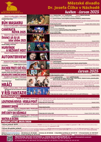 P%u0158EDPRODEJ ONLINE VSTUPENEK na www.beraneknachod.cz, ale i v%u00a0Informa%u010dn%u00edch centrech:MIC N%u00e1chod, tel.: 491 426 060, IC Hronov, tel.: 491%u00a0483%u00a0646, IC N. M%u011bsto n. Met., tel.: 491 472%u00a0119,IC%u00a0%u010cerven%u00fd Kostelec, tel.: 498%u00a0100%u00a0657, RIC %u010cesk%u00e1 Skalice, tel.: 491 453%u00a0870 a IC Police n. Metuji, tel.: 491 421 501BER%u00c1NEK N%u00c1CHOD a.s. kve%u02c7ten - %u010derven 2025M%u011bstsk%u00e9 divadlo Dr. Josefa %u010c%u00ed%u017eka v%u00a0N%u00e1chod%u011b%u00dater%u00fd 13. kv%u011btna 2025 v%u00a019.00 hodin8. p%u0159edstaven%u00ed v r%u00e1mci %u201eMODR%u00c9HO%u201c abonm%u00e1 2024/2025%u010cinohern%u00ed klub PrahaB%u016eH MASAKRUAutor: Yasmina Reza Re%u017eie: Ond%u0159ej Sokol P%u0159eklad: Michal L%u00e1z%u0148ovsk%u00fdNem%u016f%u017eeme ovl%u00e1dnout, co n%u00e1s ovl%u00e1d%u00e1. Komedie o %u017eivlech v lidsk%u00e9m nitru.Hraj%u00ed: Jarom%u00edr Dulava, Ivana Ch%u00fdlkov%u00e1, Miroslava Ple%u0161tilov%u00e1, Vladim%u00edr KratinaJsme lid%u00e9 kultury, rozumu, anebo jsme jen bezmocn%u00e9 individu%u00e1ln%u00ed ob%u011bti sv%u00fdch pud%u016f? Hra, b%u011bhem n%u00ed%u017e se bort%u00ed o%u010dek%u00e1van%u00e9 stereotypy chov%u00e1n%u00ed: do lehkosti konverza%u010dn%u00ed fra%u0161ky %u010d%u00edm d%u00e1l v%u00edc prosakuje podv%u011bdom%u00ed akt%u00e9r%u016f a p%u0159ed n%u00e1mi se odkr%u00fdvaj%u00ed tajen%u00e9 animozity %u017eivota v p%u00e1ru, fale%u0161 leckter%u00fdch kulturn%u00edch a mor%u00e1ln%u00edch kli%u0161%u00e9 i drav%u010d%u00ed podstata existen%u010dn%u00edho boje.P%u0159edprodej ji%u017e prob%u00edh%u00e1! Vstupn%u00e9: 590 K%u010d, 560 K%u010d, 530 K%u010dSt%u0159eda 14. kv%u011btna 2025 v%u00a019.00 hodin10. koncert v%u00a0r%u00e1mci abonentn%u00edho cyklu %u201eK%u201c 2024/2025CAMERATA NOVA 2025Vystoup%u00ed: Komorn%u00ed orchestr Sl%u00e1vy Vorlov%u00e9 N%u00e1chod%u00a0Program:Georg Philipp Telemann:%u00a0Ouverture F dur Georg Christoph Wagenseil:%u00a0Koncert pro trombon a orchestr, solo:%u00a0%u0160t%u011bp%u00e1n Ty%u010d%u00a0trombonFranz Anton Hoffmeister:%u00a0Koncert pro violu a orchestr, solo:%u00a0Ji%u0159%u00ed Pinkas%u00a0viola%u00a0John Rutter:%u00a0Suite for Strings P%u0159edprodej ji%u017e prob%u00edh%u00e1! Vstupn%u00e9: 140 K%u010d, 120 K%u010d, 100 K%u010dP%u00e1tek 16. kv%u011btna 2025 v%u00a019.00 hodin%u0160VANCI J%u00c1 SU J%u00c1 tour show 2025%u010cekaj%u00ed v%u00e1s vtipn%u00e9 historky, od kari%u00e9ry fotbalisty, velkolep%u00e9 rozlu%u010dky za Lu%u017e%u00e1nkami, n%u00e1v%u0161t%u011bv r%u016fzn%u00fdch z%u00e1bavn%u00edch po%u0159ad%u016f, a%u017e po %u00fa%u010dast v reality show Survivor. D%u00e1le se t%u011b%u0161te na prostor pro ot%u00e1zky na t%u011blo, autogrami%u00e1du, focen%u00ed a mnoho dal%u0161%u00edho. P%u0159edprodej v s%u00edti smsticket.cz Vstupn%u00e9:%u00a0490 K%u010d%u00a0 %u00a0%u00dater%u00fd 20. kv%u011btna 2025 v%u00a011.00 hodinDivadlo Spejbla a Hurv%u00ednkaHURV%u00cdNEK A NEZVAN%u00dd HOST P%u0159edstavte si, %u017ee u v%u00e1s jednoho dne zaklepe nezvan%u00fd host. Nejen%u017ee je nezvan%u00fd, ale nav%u00edc je %u00fapln%u011b jin%u00fd ne%u017e kdokoliv a cokoliv, co zn%u00e1te. A to se p%u0159esn%u011b stane u Spejbl%u016f. Z ni%u010deho nic u nich bydl%u00ed %u010clunozobec a Spejbl s Hurv%u00ednkem jsou r%u00e1zem podn%u00e1jemn%u00edci ve vlastn%u00edm byt%u011b. Proto%u017ee m%u00e1 %u010clunozobec opravdu nezvykl%u00e9 pot%u0159eby a ritu%u00e1ly, nen%u00ed mo%u017en%u00e9 s n%u00edm spole%u010dn%u00fd prostor sd%u00edlet. Jen%u017ee %u010clunozobec v%u0161echno v%u00ed, v%u0161ude byl a neplat%u00ed na n%u011bj %u017e%u00e1dn%u00e9 logick%u00e9 argumenty, se kter%u00fdmi na n%u011bj Spejbl vyrukuje. Za to Hurv%u00ednek, ten si v%u00ed v%u017edycky rady, na n%u011bj je i %u010clunozobec kr%u00e1tk%u00fd a nebo je to naopak? D%u00e9lka p%u0159edstaven%u00ed je 50 minut. Doporu%u010deno od 4 let Vstupn%u00e9:%u00a0150 K%u010d%u00a0 %u00a0%u00dater%u00fd 27. kv%u011btna 2025 v%u00a019.00 hodinAUTOINTERVIEW!O herectv%u00ed? O %u017een%u00e1ch? O spole%u010dnosti? O pivu? O fotbale?Ond%u0159ej Vetch%u00fd a Michal Novotn%u00fd ve zcela nov%u00e9m po%u0159adu, kter%u00fd V%u00e1s nech%u00e1 nakouknout do %u017eivota t%u011bchto dvou popul%u00e1rn%u00edch herc%u016f.Bude %u010das si popov%u00eddat o %u010demkoliv, nap%u0159%u00edklad i o z%u00e1kulis%u00ed nat%u00e1%u010den%u00ed seri%u00e1l%u016f jako jsou P%u0159%u00edpady 1. odd%u011blen%u00ed, Okresn%u00ed p%u0159ebor, Devades%u00e1tky %u010di Krimin%u00e1lka And%u011bl. P%u0159ij%u010fte se o tom p%u0159esv%u011bd%u010dit a tak%u00e9 se zapojit sv%u00fdmi dotazy do AutoInterview. Jedine%u010dn%u00e1 mo%u017enost vz%u00e1jemn%u011b se poznat a vid%u011bt Ond%u0159eje Vetch%u00e9ho a Michala Novotn%u00e9ho zbl%u00edzka.Pr%u00e1v%u011b o tom AUTOINTERVIEW bude%u2026. Po skon%u010den%u00ed bude %u010das i na autogrami%u00e1du a mo%u017enost se vyfotit.P%u0159edprodej ji%u017e prob%u00edh%u00e1! Vstupn%u00e9: 490 K%u010d a 450 K%u010dSt%u0159eda 28. kv%u011btna 2025 v%u00a019.00 hodin7. p%u0159edstaven%u00ed v r%u00e1mci %u201eZELEN%u00c9HO%u201c abonm%u00e1 2024/2025FANNY Agentura Praha Jakub Zindulka: DUCHEM PROTI SV%u00c9 V%u016eLIRe%u017eie: Jakub ZindulkaHraj%u00ed: Ivana Jire%u0161ov%u00e1, Dana Homolov%u00e1, Jarom%u00edr Nosek a Jakub ZindulkaBylo %u00famrt%u00ed slavn%u00e9 here%u010dky p%u0159irozen%u00e9, nebo to byla vra%u017eda? A stra%u0161%u00ed jej%u00ed duch opravdu, nebo jen nev%u011brn%u00e9mu man%u017eelovi stra%u0161%u00ed %u201eve v%u011b%u017ei%u201c? A p%u0159ibude je%u0161t%u011b dal%u0161%u00ed ob%u011b%u0165? A bude zlo potrest%u00e1no, jako v ka%u017ed%u00e9 dobr%u00e9 poh%u00e1dce? Odpov%u011bdi se dozv%u00edte v nov%u00e9, tentokr%u00e1t ducha%u0159sk%u00e9 detektivn%u00ed bl%u00e1zniv%u00e9 komedii op%u011bt z pera Jakuba Zindulky.P%u0159edprodej ji%u017e prob%u00edh%u00e1!. Vstupn%u00e9: 390 K%u010d, 370 K%u010d, 350 K%u010dP%u00e1te