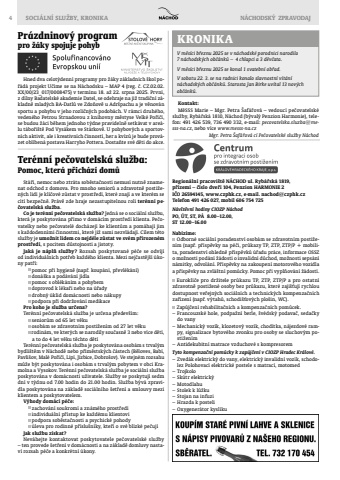 4 SOCI%u00c1LN%u00cd SLU%u017dBY, KRONIKA N%u00c1CHODSK%u00dd%u2009 ZPRAVODAJ KRONIKARegion%u00e1ln%u00ed pracovi%u0161t%u011b N%u00c1CHOD ul. Ryb%u00e1%u0159sk%u00e1 1819, p%u0159%u00edzem%u00ed %u2013 %u010d%u00edslo dve%u0159%u00ed 104, Penzion HARMONIE 2I%u010cO 26594145, www.czphk.cz, e-mail. nachod@czphk.czTelefon 491 426 027, mobil 606 754 725N%u00e1v%u0161t%u011bvn%u00ed hodiny CIOZP N%u00e1chodPO, %u00daT, ST, P%u00c1 8.00%u201312.00, ST 12.00%u201316.00Nab%u00edz%u00edme: Odborn%u00e9 soci%u00e1ln%u00ed poradenstv%u00ed osob%u00e1m se zdravotn%u00edm posti%u017een%u00edm (nap%u0159. p%u0159%u00edsp%u011bvky na p%u00e9%u010di, pr%u016fkazy TP, ZTP, ZTP/P + mobilita, poradenstv%u00ed ohledn%u011b p%u0159%u00edsp%u011bvk%u016f %u00fa%u0159adu pr%u00e1ce, informace OSSZ o mo%u017enosti pod%u00e1n%u00ed %u017e%u00e1dosti o invalidn%u00ed d%u016fchod, mo%u017enosti seps%u00e1n%u00ed n%u00e1mitky, odvol%u00e1n%u00ed. P%u0159%u00edsp%u011bvky na zakoupen%u00ed motorov%u00e9ho vozidla a p%u0159%u00edsp%u011bvky na zvl%u00e1%u0161tn%u00ed pom%u016fcky. Pomoc p%u0159i vypl%u0148ov%u00e1n%u00ed %u017e%u00e1dost%u00ed. Eurokl%u00ed%u010de pro dr%u017eitele pr%u016fkazu TP, ZTP, ZTP/P a pro ostatn%u00ed zdravotn%u011b posti%u017een%u00e9 osoby bez pr%u016fkazu, kter%u00e9 zaji%u0161%u0165uj%u00ed rychlou dostupnost ve%u0159ejn%u00fdch soci%u00e1ln%u00edch a technick%u00fdch kompenza%u010dn%u00edch za%u0159%u00edzen%u00ed (nap%u0159. v%u00fdtah%u016f, schodi%u0161%u0165ov%u00fdch plo%u0161in, WC). Zap%u016fj%u010den%u00ed rehabilita%u010dn%u00edch a kompenza%u010dn%u00edch pom%u016fcek.%u2013 Francouzsk%u00e9 hole, podpa%u017en%u00ed berle, %u0161v%u00e9dsk%u00fd podava%u010d, seda%u010dky do vany%u2013 Mechanick%u00fd voz%u00edk, klozetov%u00fd voz%u00edk, chod%u00edtka, n%u00e1jezdov%u00e9 rampy, signalizace bytov%u00e9ho zvonku pro osoby se sluchov%u00fdm posti%u017een%u00edm%u2013 Antidekubitn%u00ed matrace vzduchov%u00e9 s kompresoremTyto kompenza%u010dn%u00ed pom%u016fcky k zap%u016fj%u010den%u00ed v CIOZP Hradec Kr%u00e1lov%u00e9.%u2013 Zved%u00e1k elektrick%u00fd do vany, elektrick%u00fd invalidn%u00ed voz%u00edk, schodolez Polohovac%u00ed elektrick%u00e9 postele s matrac%u00ed, motomed%u2013 Trojkolo%u2013 Sk%u00fatr elektrick%u00fd %u2013 Motodlahu %u2013 Stolek k l%u016f%u017eku%u2013 Stojan na infuzi%u2013 Hrazda k posteli%u2013 Oxygener%u00e1tor kysl%u00edkuV m%u011bs%u00edci b%u0159eznu 2025 se v n%u00e1chodsk%u00e9 porodnici narodilo 7 n%u00e1chodsk%u00fdch ob%u010d%u00e1nk%u016f %u2013 4 chlapci a 3 d%u011bv%u010data.V m%u011bs%u00edci b%u0159eznu 2025 se konal 1 svatebn%u00ed ob%u0159ad.V sobotu 22. 3. se na radnici konalo slavnostn%u00ed v%u00edt%u00e1n%u00ed n%u00e1chodsk%u00fdch ob%u010d%u00e1nk%u016f. Starosta Jan Birke uv%u00edtal 13 nov%u00fdch ob%u010d%u00e1nk%u016f.Ter%u00e9nn%u00ed pe%u010dovatelsk%u00e1 slu%u017eba:Pomoc, kter%u00e1 p%u0159ich%u00e1z%u00ed dom%u016fSt%u00e1%u0159%u00ed, nemoc nebo ztr%u00e1ta sob%u011bsta%u010dnosti nemus%u00ed nutn%u011b znamenat odchod z domova. Pro mnoho senior%u016f a zdravotn%u011b posti%u017een%u00fdch lid%u00ed je kl%u00ed%u010dov%u00e9 z%u016fstat v prost%u0159ed%u00ed, kter%u00e9 znaj%u00ed a ve kter%u00e9m se c%u00edt%u00ed bezpe%u010dn%u011b. Pr%u00e1v%u011b zde hraje nezastupitelnou roli ter%u00e9nn%u00ed pe%u010dovatelsk%u00e1 slu%u017eba.Co je ter%u00e9nn%u00ed pe%u010dovatelsk%u00e1 slu%u017eba? Jedn%u00e1 se o soci%u00e1ln%u00ed slu%u017ebu, kter%u00e1 je poskytov%u00e1na p%u0159%u00edmo v dom%u00e1c%u00edm prost%u0159ed%u00ed klienta. Pe%u010dovatelky nebo pe%u010dovatel%u00e9 doch%u00e1zej%u00ed ke klient%u016fm a pom%u00e1haj%u00ed jim s ka%u017edodenn%u00edmi %u010dinnostmi, kter%u00e9 ji%u017e sami nezvl%u00e1daj%u00ed. C%u00edlem t%u00e9to slu%u017eby je umo%u017enit lidem co nejd%u00e9le z%u016fstat ve sv%u00e9m p%u0159irozen%u00e9m prost%u0159ed%u00ed, s pocitem d%u016fstojnosti a jistoty.Jak%u00e1 je n%u00e1pl%u0148 slu%u017eby? Rozsah poskytovan%u00e9 p%u00e9%u010de se odv%u00edj%u00ed od individu%u00e1ln%u00edch pot%u0159eb ka%u017ed%u00e9ho klienta. Mezi nej%u010dast%u011bj%u0161%u00ed %u00fakony pat%u0159%u00ed: pomoc p%u0159i hygien%u011b (nap%u0159. koup%u00e1n%u00ed, p%u0159evl%u00e9k%u00e1n%u00ed) don%u00e1%u0161ka a pod%u00e1v%u00e1n%u00ed j%u00eddla pomoc s obl%u00e9k%u00e1n%u00edm a pohybem doprovod k l%u00e9ka%u0159i nebo na %u00fa%u0159ady drobn%u00fd %u00faklid dom%u00e1cnosti nebo n%u00e1kupy podpora p%u0159i dodr%u017eov%u00e1n%u00ed medikacePro koho je slu%u017eba ur%u010dena?Ter%u00e9nn%u00ed pe%u010dovatelsk%u00e1 slu%u017eba je ur%u010dena p%u0159edev%u0161%u00edm: senior%u016fm od 65 let v%u011bku osob%u00e1m se zdravotn%u00edm posti%u017een%u00edm od 27 let v%u011bku rodin%u00e1m, ve kter%u00fdch se narodily sou%u010dasn%u011b 3 nebo v%u00edce d%u011bt%u00ed, a to do 4 let v%u011bku t%u011bchto d%u011bt%u00edTer%u00e9nn%u00ed pe%u010dovatelsk%u00e1 slu%u017eba je poskytov%u00e1na osob%u00e1m s trval%u00fdm bydli%u0161t%u011bm v N%u00e1chod%u011b nebo p%u0159%u00edm%u011bstsk%u00fdch %u010d%u00e1stech (B%u011bloves, Bab%u00ed, Pavli%u0161ov, Mal%u00e9 Po%u0159%u00ed%u010d%u00ed, Lip%u00ed, Jizbice, Dobro%u0161ov). Ve stejn%u00e9m rozsahu m%u016f%u017ee b%u00fdt poskytov%u00e1na i osob%u00e1m s trval%u00fdm pobytem v obci Kramolna a Vysokov. Ter%u00e9nn%u00ed pe%u010dovatelsk%u00e1 slu%u017eba je soci%u00e1ln%u00ed slu%u017eba poskytov%u00e1na v dom%u00e1cnosti u%u017eivatele. Slu%u017eby se poskytuj%u00ed sedm dn%u00ed v t%u00fddnu od 7.00 hodin do 21.00 hodin. Slu%u017eba b%u00fdv%u00e1 zpravidla poskytov%u00e1na na z%u00e1klad%u011b soci%u00e1ln%u00edho %u0161et%u0159en%u00ed a smlouvy mezi klientem a poskytovatelem.V%u00fdhody dom%u00e1c%u00ed p%u00e9%u010de: zachov%u00e1n%u00ed soukrom%u00ed a zn%u00e1m%u00e9ho prost%u0159ed%u00ed individu%u00e1ln%u00ed p%u0159%u00edstup ke ka%u017ed%u00e9mu klientovi podpora sob%u011bsta%u010dnosti a psychick%u00e9 pohody %u00faleva pro rodinn%u00e9